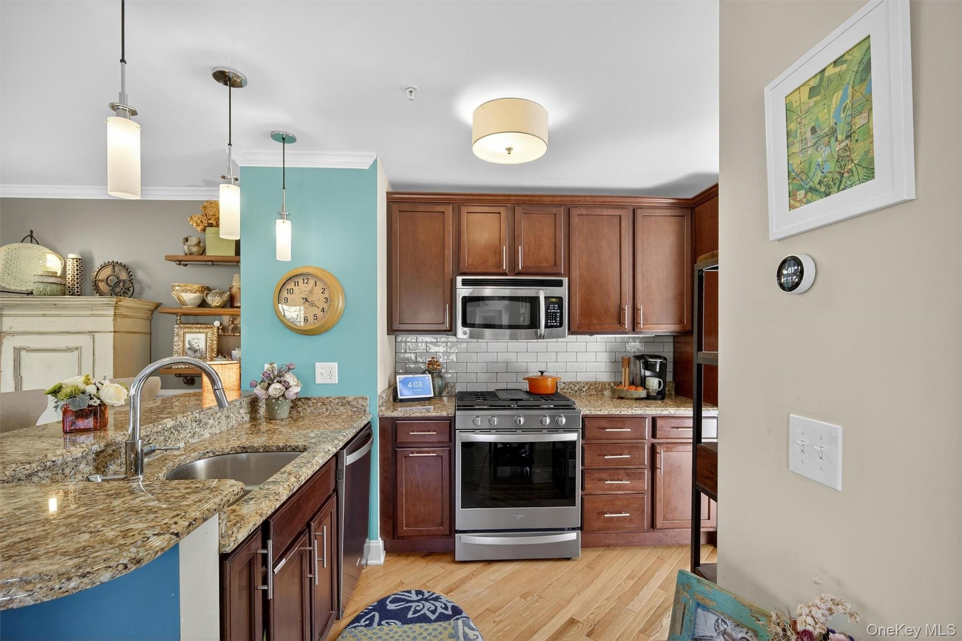 - Notice the custom lighting in the kitchen and the beautiful backsplash.