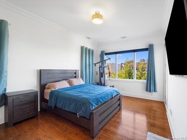 - Bedroom with dark wood finished floors and crown molding