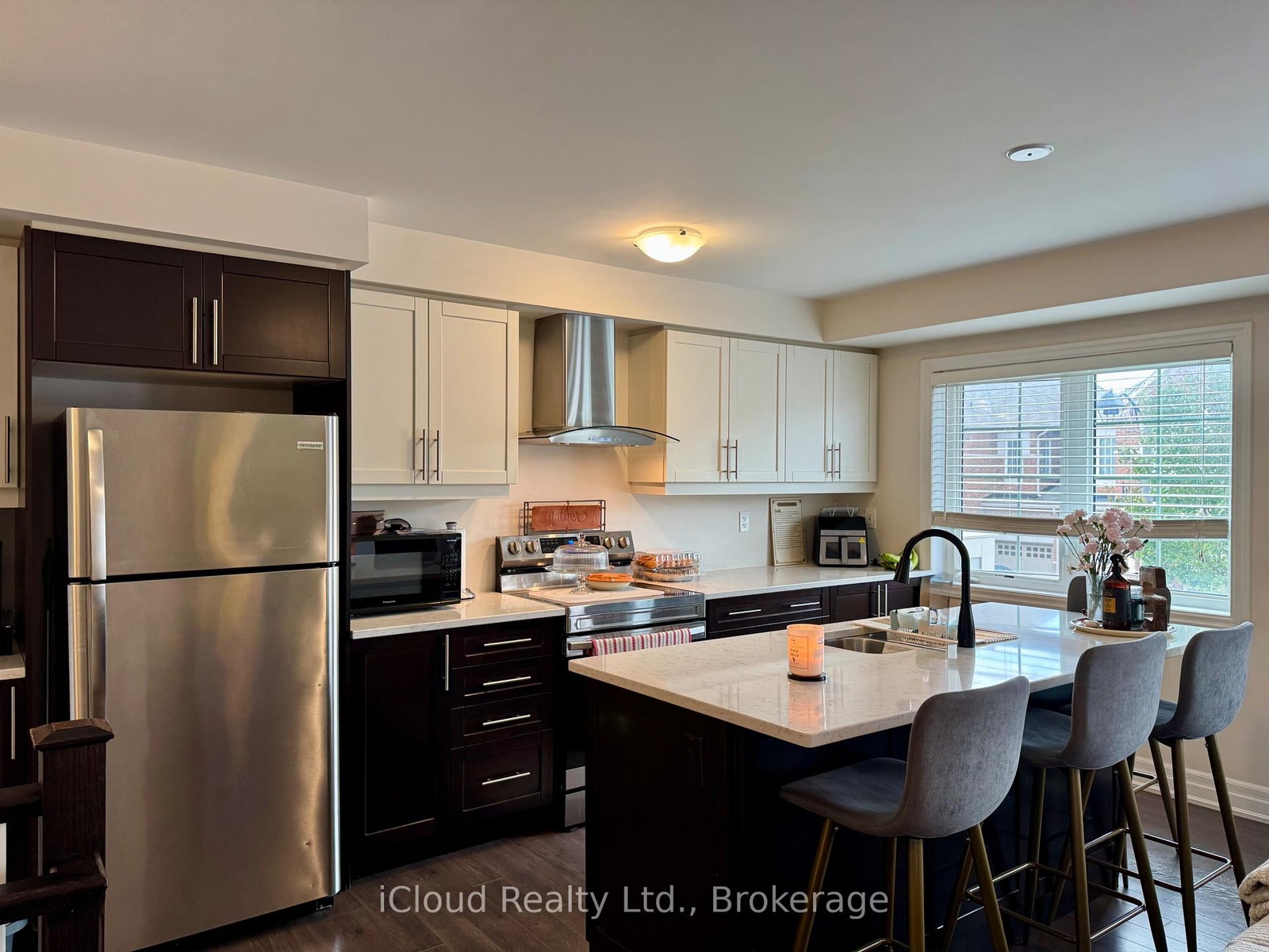 Stunning Mattamy-Built Executive Freehold Townhome in Oakville's Highly Coveted Preserve Community! This Vanessa Model end-unit offers approximately 1,540 sq. ft. of contemporary elegance, thoughtfully designed with premium upgrades throughout. The bright, open-concept layout features a modern white and espresso kitchen with stainless steel appliances, quartz countertops, and stylish cabinetry that perfectly complements the homes sleek design. Enjoy dark espresso hardwood staircases and laminate flooring that flow seamlessly across the main, second, and third level. Upstairs, you'll find three spacious bedrooms and three well-appointed bathrooms, including a luxurious primary suite with a four-piece ensuite, shower/bathtub, and a large walk-in closet. The second level also includes a beautifully upgraded four-piece main bath. The ground level offers a convenient garage entrance, ample storage, and a dedicated office space perfect for remote work or study. Located in one of Oakville's most desirable neighbourhoods, this home combines upscale finishes, functional living, and a welcoming community atmosphere just minutes from parks, top-rated schools, shopping, and major highways.