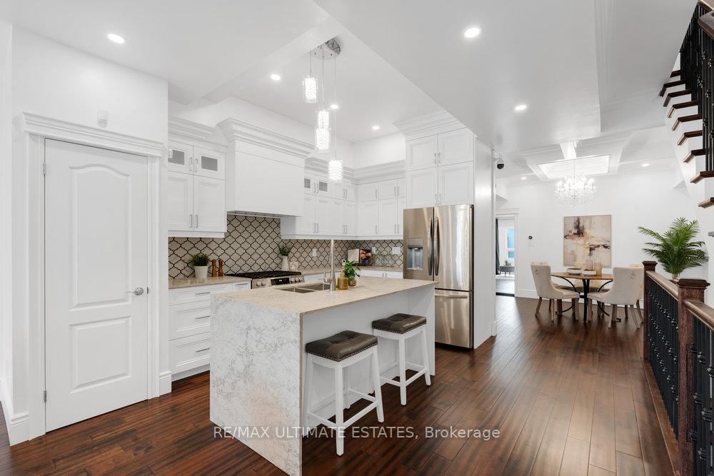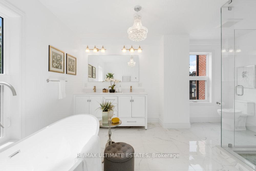 Located in the heart of downtown Toronto, this luxury estate is perfectly positioned across from Alexandra Park and steps from the University of Toronto, OCAD University, Toronto Western Hospital and the Financial District, in the Trinity Bellwood neighbourhood. Wake up every morning to the scenery of a beautiful park across the street, with a view of the CN Tower peaking above the trees. Offering unmatched access to downtown living with privacy and exclusivity, this home is a true masterpiece. COMPLETELY UPDATED STRUCTURE, PLUMBING, ELECTRICAL AND HVAC TO APPROVED BUILDING CODE STANDARDS, this house is meticulously renovated (over $500K) with no expense spared. The open-concept main floor features crystal chandeliers, soaring coffered ceilings, and gleaming hardwood floors. The chef's kitchen, equipped with premium smart appliances, features full height custom cabinetry, luxurious Caesarstone granite countertops, and a spacious center island with a dramatic waterfall edge and bistro-style seating. Upstairs, the primary suite is a serene sanctuary with a custom walk-in closet, and a personal luxurious oasis spa retreat main bathroom, complete with rainfall shower head, large soaker tub, heated floors, and towel warmer. The finished basement offers flexible space, including a private in-law suite with its own entrance, ideal for multigenerational living or rental income. Outside, enjoy a private garden oasis and a two-car garage with app-controlled automatic doors and EV charger, permitted for future conversion into a coach house. This home also offers top-of-the-line security, with 24/7 camera coverage, reinforced steel doors, and state-of-the-art features for peace of mind. A rare opportunity to own a refined and luxurious home in one of Toronto's most desired neighbourhoods.