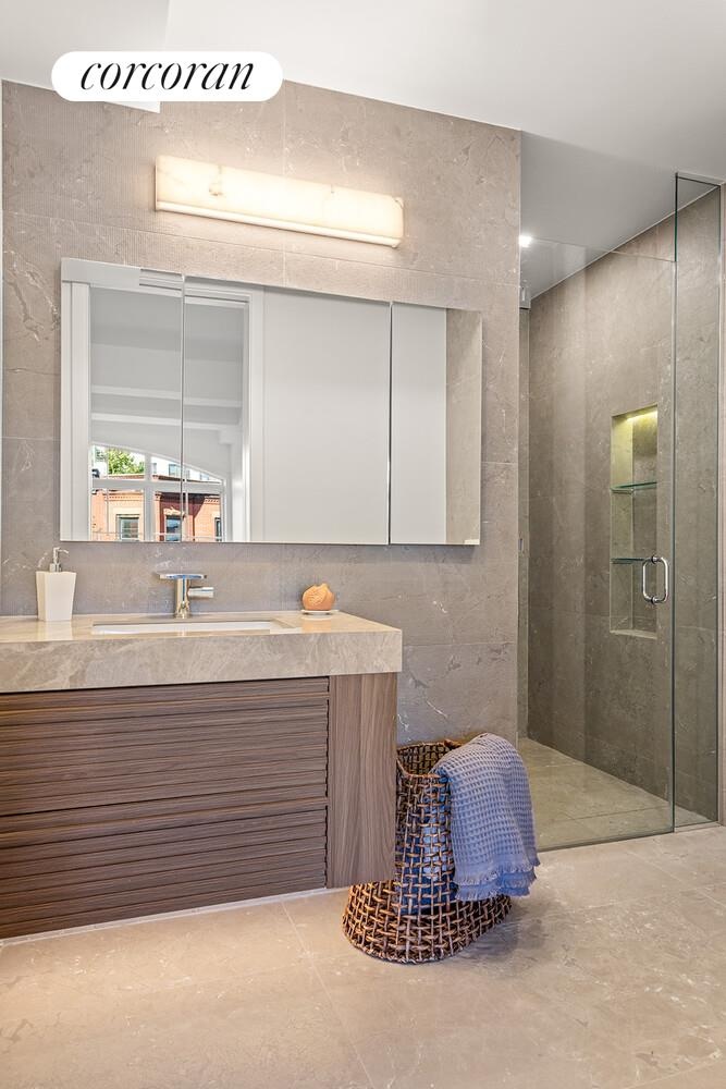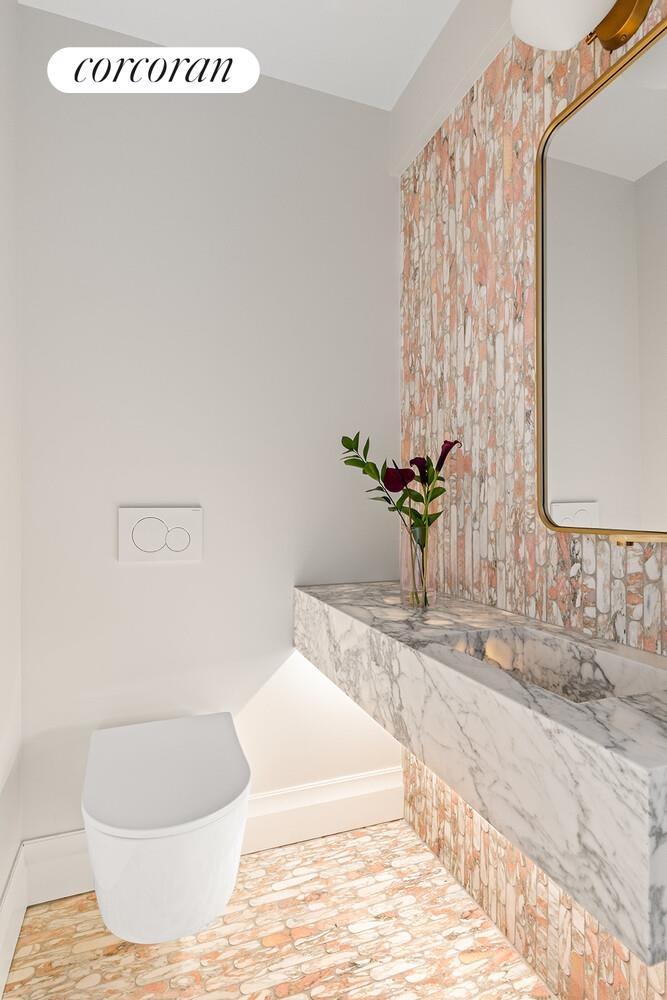 The entry level welcomes you with an expansive open living/dining area, anchored by a full wall of glass that flows seamlessly onto a private terrace, extending the living space outdoors. The chef's kitchen is appointed with a Wolf oven, cooktop, and microwave, along with a panel-ready Fisher & Paykel refrigerator and dishwasher. Custom cabinetry, striking Cinela quartz countertops, and a full-height backsplash complete the refined design. A Norwegian Rose marble powder room with bespoke detailing offers an additional touch of sophistication for guests. Also on this level is a generously sized primary suite with en-suite bath-an adaptable space that may serve as a fourth bedroom, lounge, or large home office. Highlighting the suite is an oversized arched carriage house window, flooding the room with natural light.