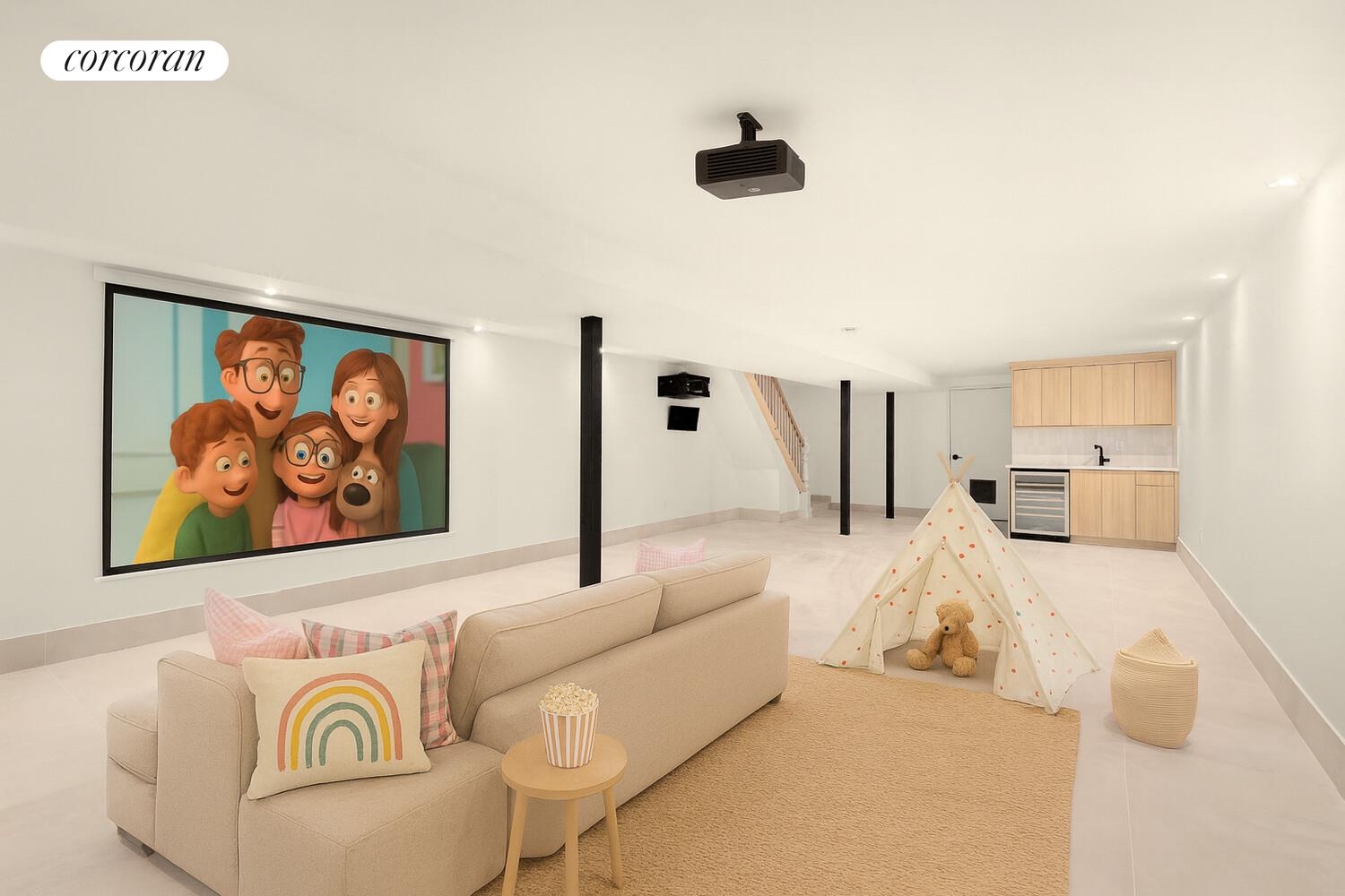 The finished basement offers high ceilings, a wet bar with wine refrigerator, and a powder room, creating the perfect flexible space for recreation, a home gym, or media area.