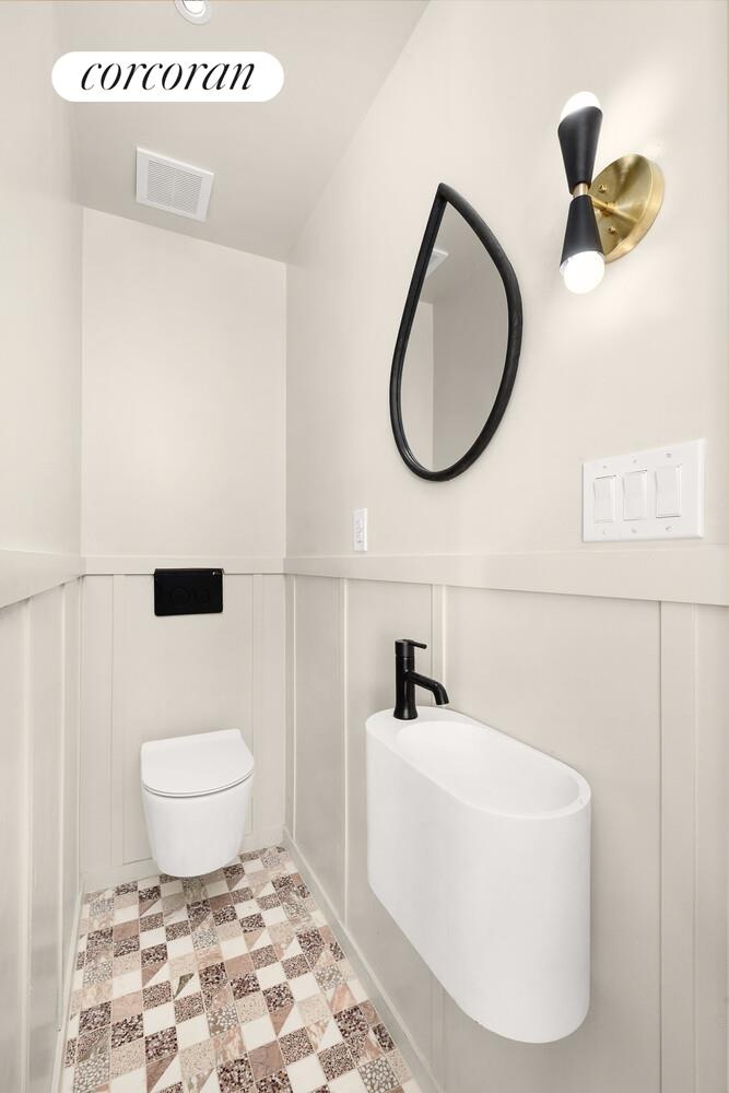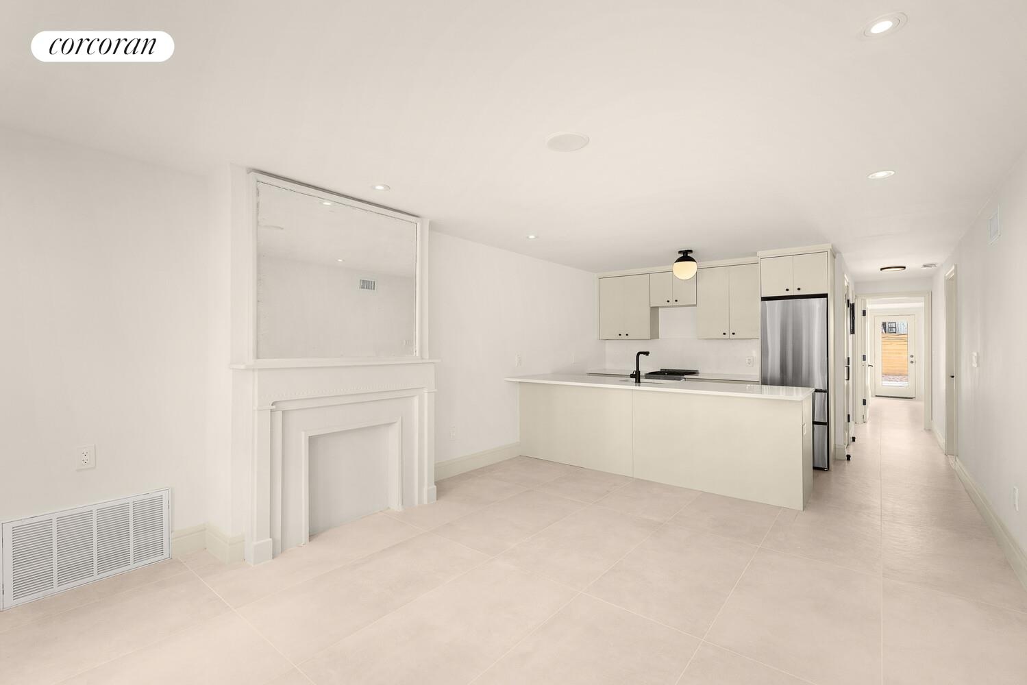 Beyond a mosaic terrazzo-tiled vestibule, an original newel post and new custom railing introduce the home's refined character. Wide-plank white-oak floors flow throughout, and arched openings create graceful transitions between spaces. The parlor floor has soaring ceilings that amplify the light and volume of the living area, anchored by a wood burning fireplace that sets a warm tone for the home. A powder room with matching terrazzo floors sits just off the entry, perfectly positioned for guests. Past a rounded archway, the custom walnut kitchen opens to the dining area and features honed Calacatta Bellini marble counters, a Wolf range, Fisher & Paykel refrigerator and dishwasher, and built-in microwave. The entire rear wall folds open with accordion doors, extending the living space to a checkered patio and landscaped garden for effortless indoor-outdoor entertaining. Designer lighting, including sculptural pendants and layered sconces, adds texture and depth throughout.