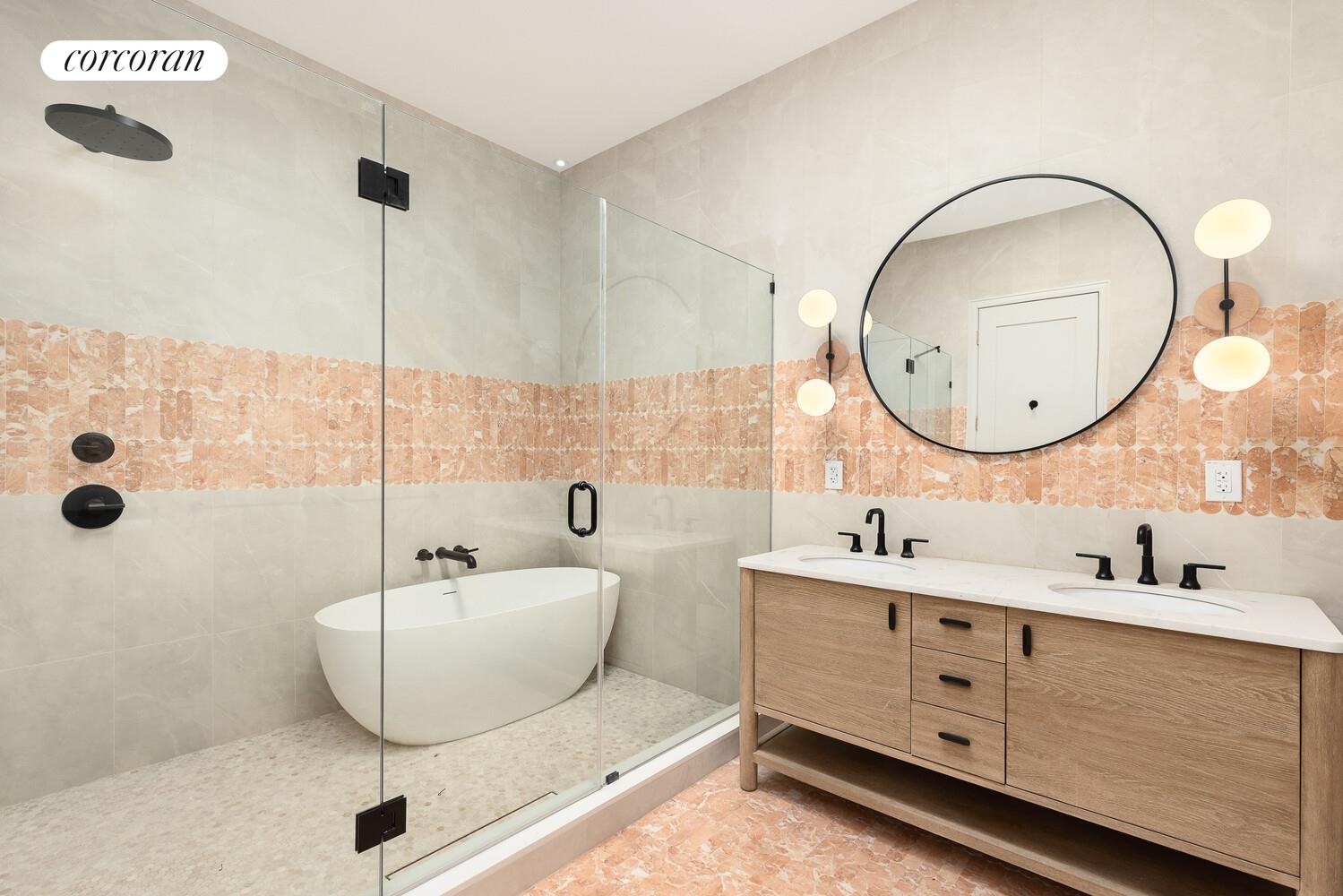 Upstairs, the top floor of the upper duplex features soaring 12-foot ceilings and three spacious bedrooms, along with two full bathrooms and laundry. The primary suite spans the full width of the house and includes two large closets and a skylit ensuite bath with honed Calacatta Bellini marble floors, a striking double vanity, and a separate wet area with both soaking tub and glass-enclosed shower with built-in niche. A second skylit bathroom serves the two additional bedrooms, and there's a linen closet for added storage. Stairs from this level lead up to a bulkhead with access to the roof.