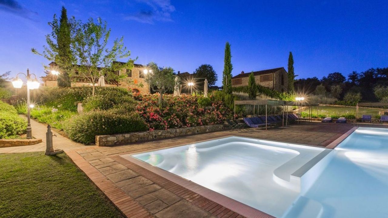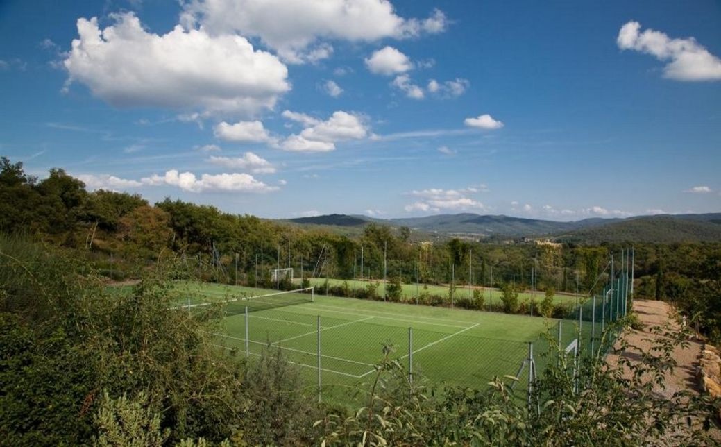 All around there are nice, mature common gardens and woods, two infinity pools, outdoor Jacuzzi and 50 sqm of solarium. Land: 79 hectares of surrounding grounds made up of 16 ha of vineyards in full production, about 5 ha of olive grove with 600 olive trees, 24 ha of arable land, about 23 ha of wood and a natural lake.The main buildings provide a fully equipped gym with changing room and a Turkish bath with mosaics. Moreover, outside there are a shared tennis court and illuminated football court. The sale includes all the storehouses, agricultural warehouses for about 600 sq meters, agricultural tools and machines such as two new tractors and oil and wine in stock.