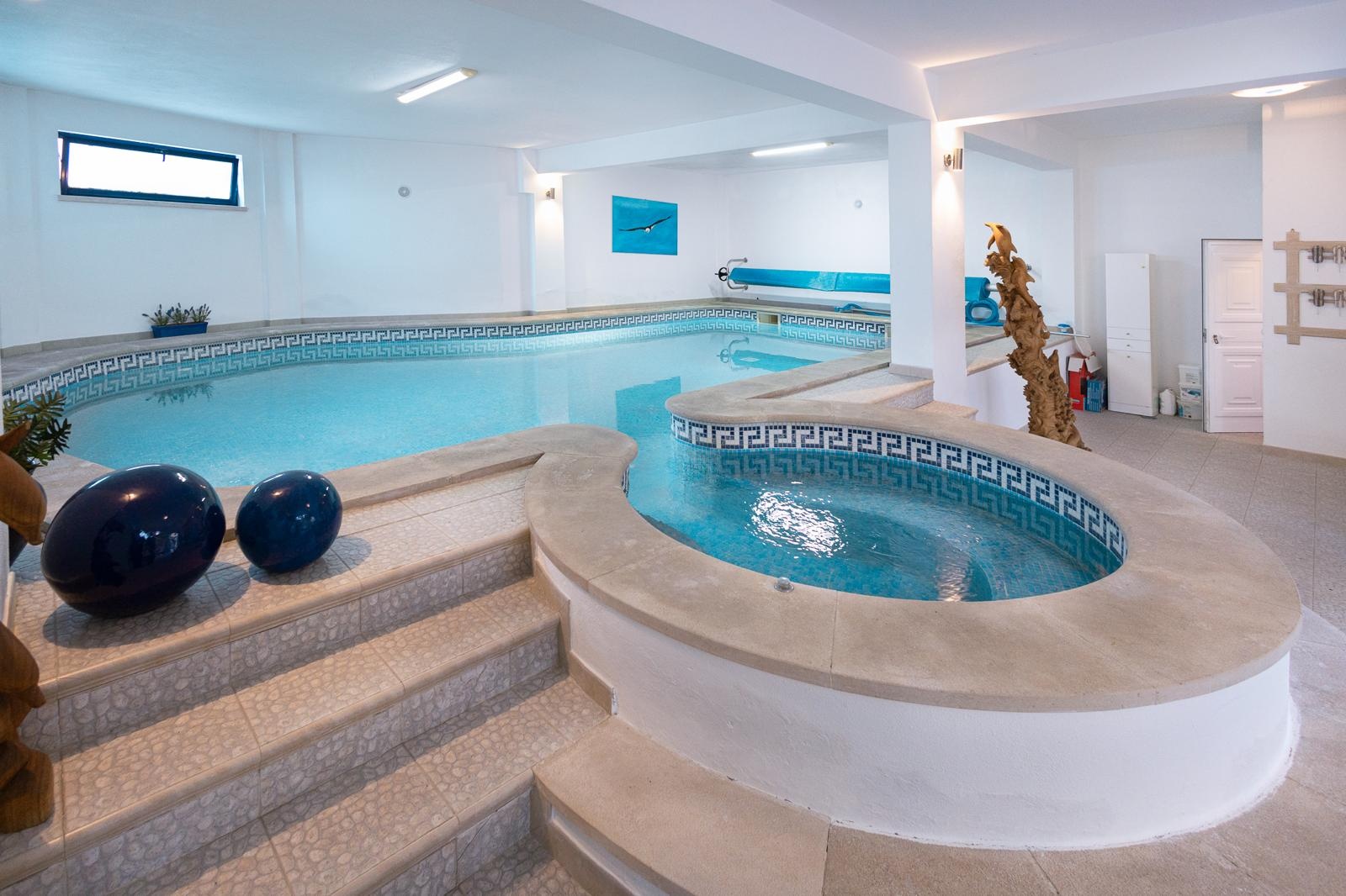 Downstairs, the property unfolds into a wellness area featuring a heated indoor swimming pool, private gym, and jacuzzi, complemented by a cozy lounge with fireplace and kitchenette, ideal for entertaining. The large garage, boiler room, and technical areas have been designed for practicality without compromising aesthetics.