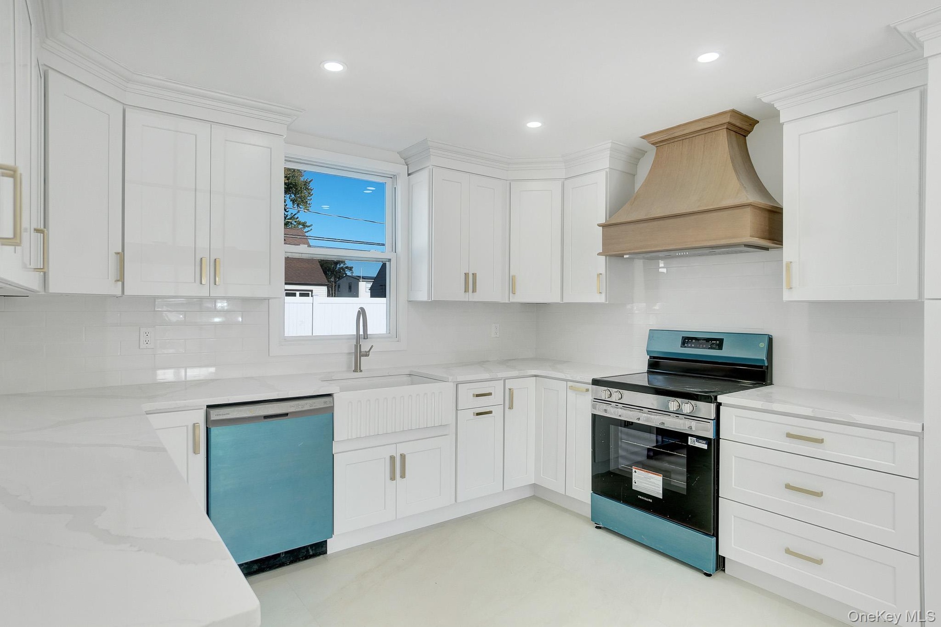 - Kitchen featuring electric stove, premium range hood, dishwasher, white cabinetry, and recessed lighting
