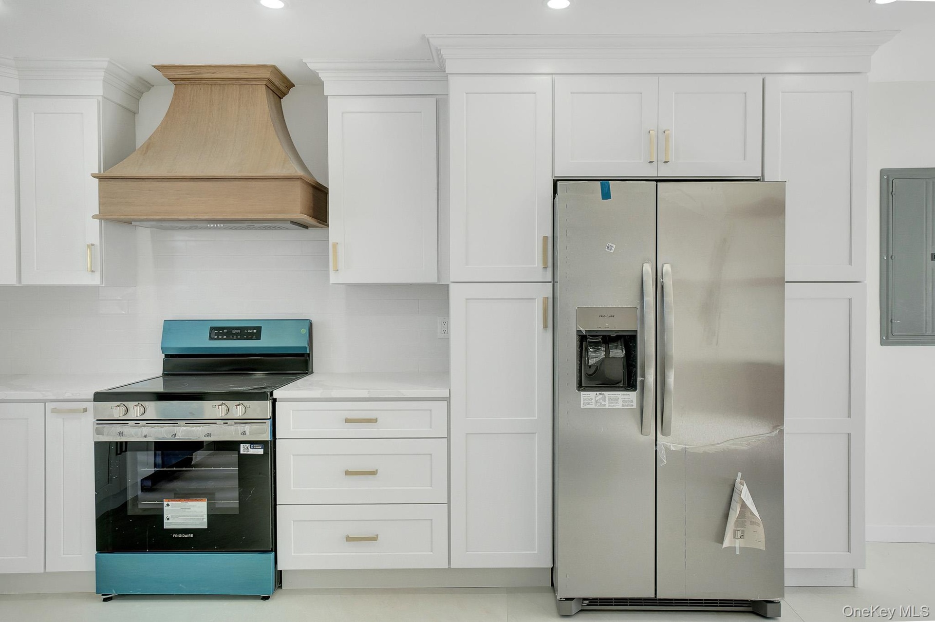 - Kitchen featuring stainless steel appliances, white cabinets, custom range hood, electric panel, and recessed lighting