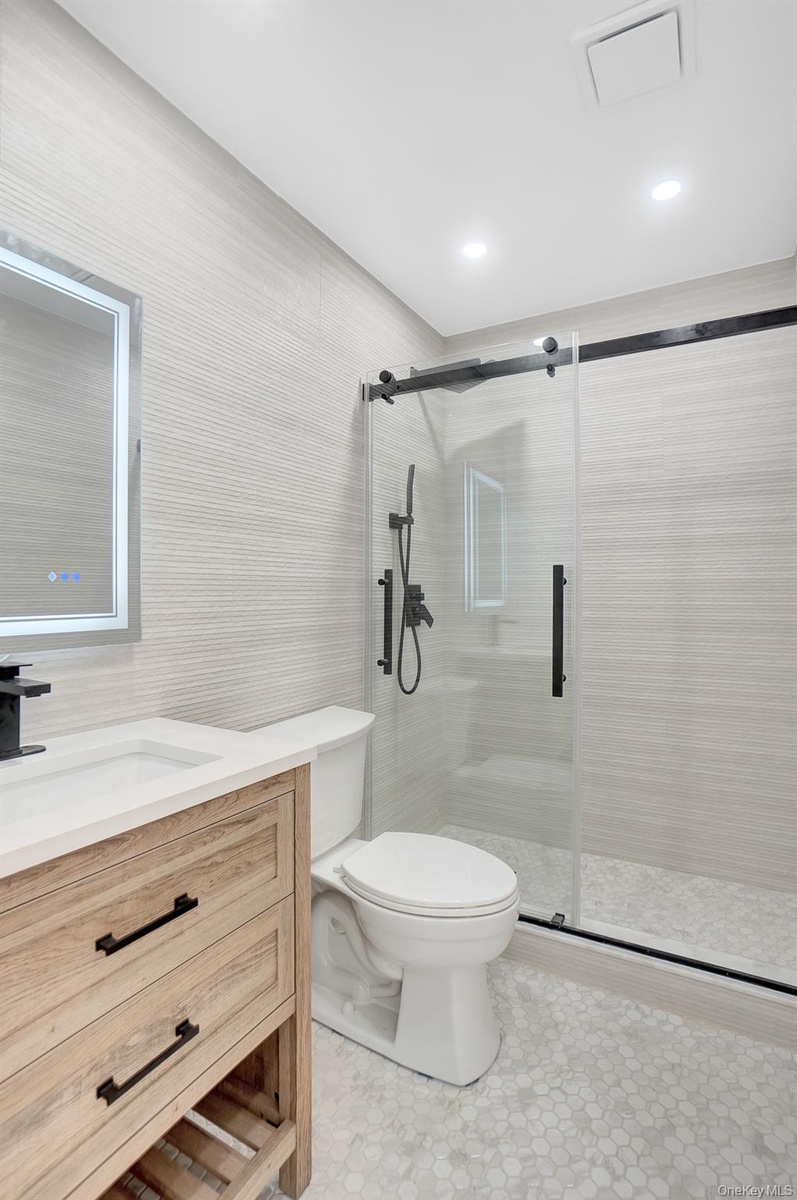 - Bathroom with vanity, a shower stall, light tile patterned floors, and tile walls