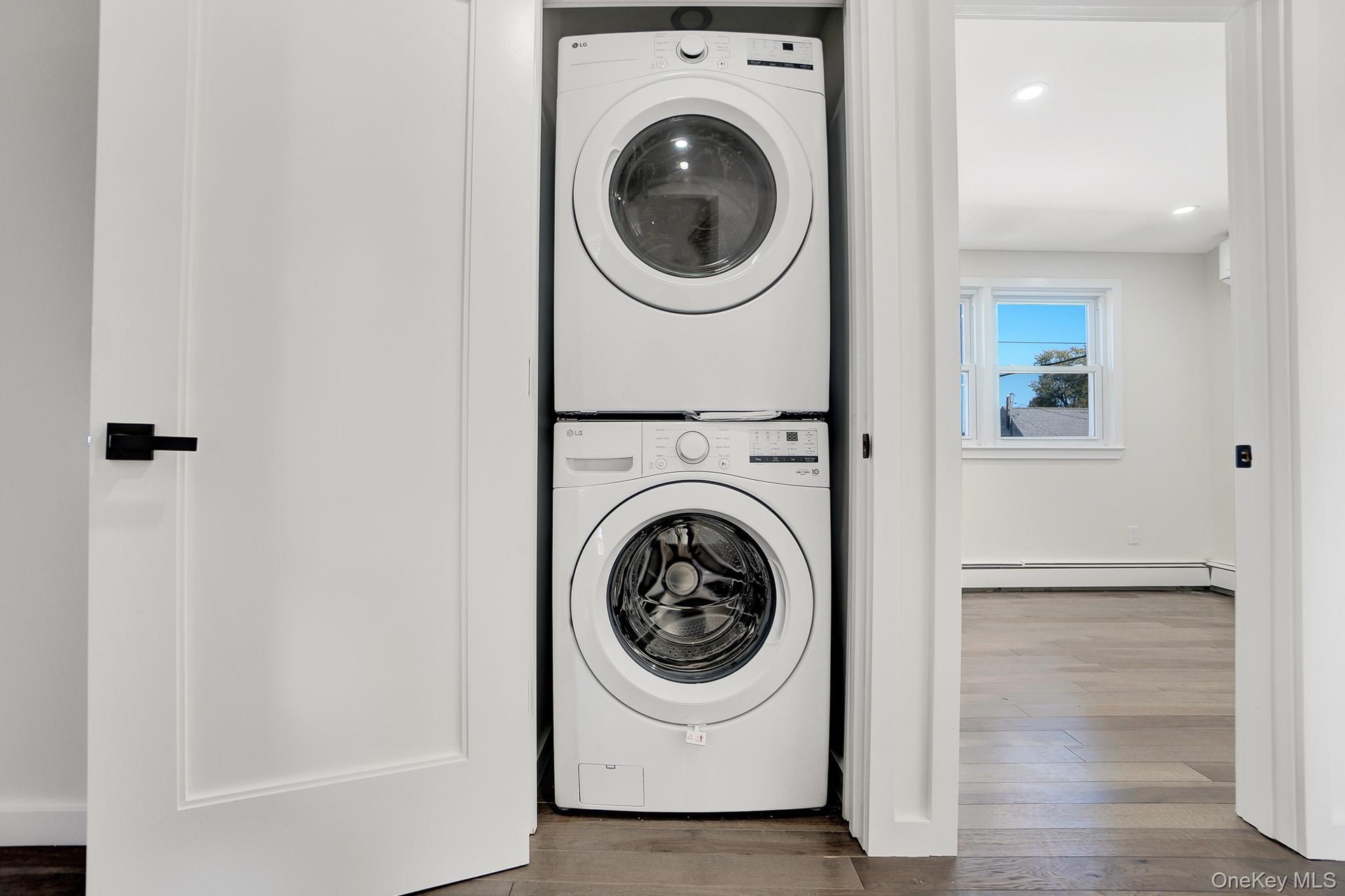 - Laundry area with stacked washer / dryer, dark wood finished floors, and baseboard heating