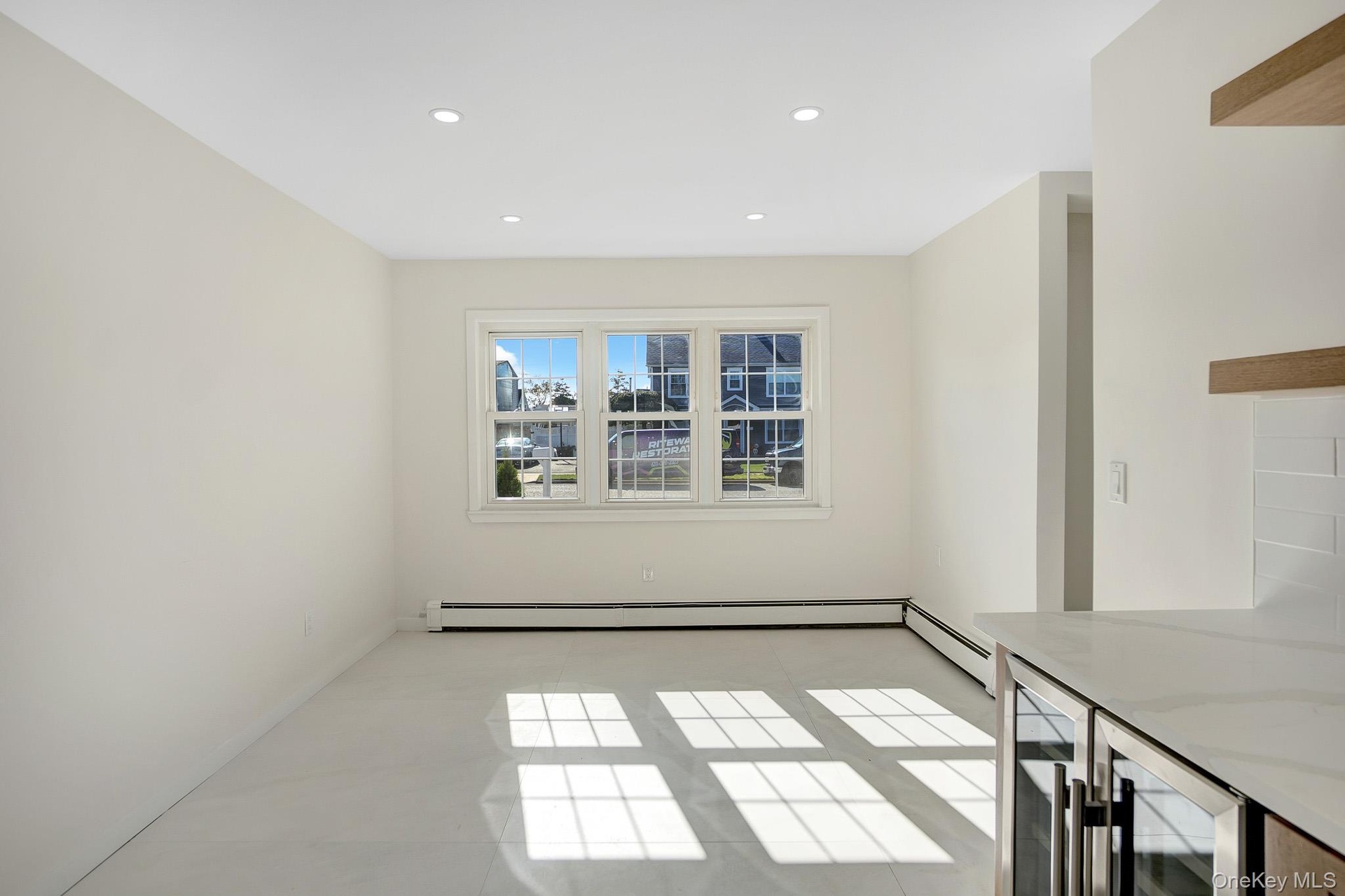 - Unfurnished dining area featuring recessed lighting, light tile patterned floors, wine cooler, and a baseboard radiator