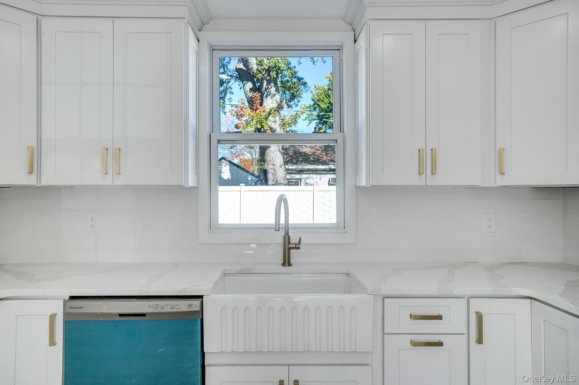 - Kitchen with white cabinets, tasteful backsplash, dishwasher, and light stone counters