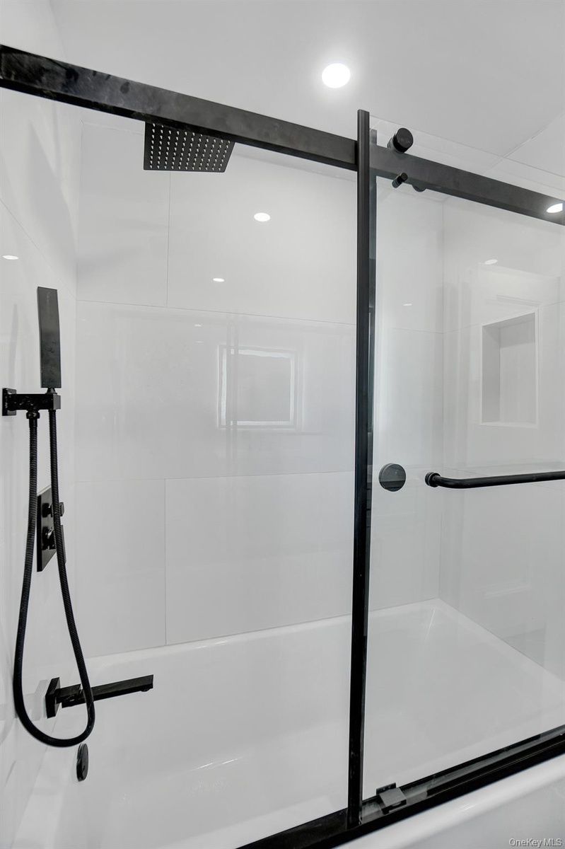 - Bathroom with vanity, shower / washtub combination, a baseboard heating unit, and recessed lighting