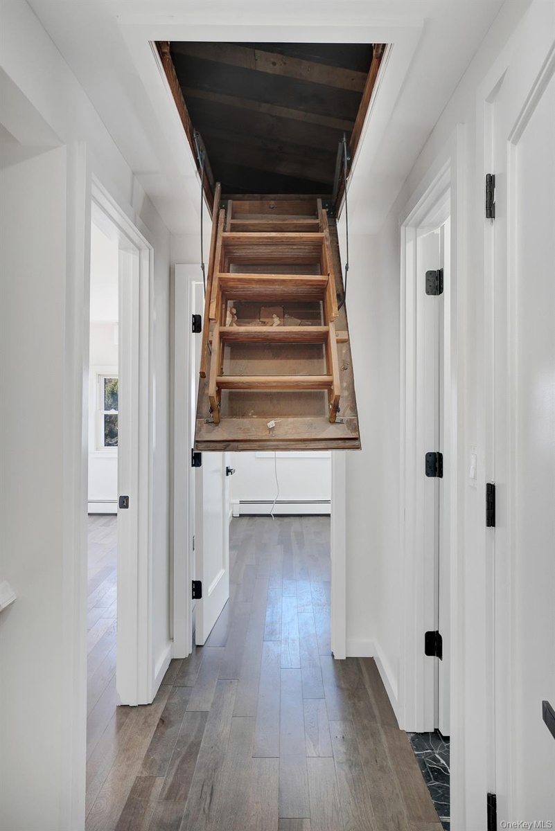 - Corridor featuring dark wood-type flooring and a baseboard radiator