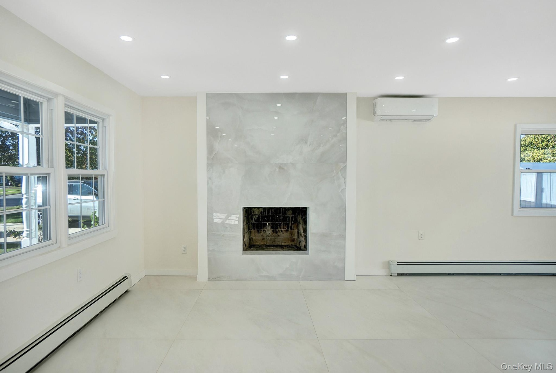 - Unfurnished living room featuring a baseboard radiator, recessed lighting, a premium fireplace, light tile patterned flooring, and a wall mounted AC