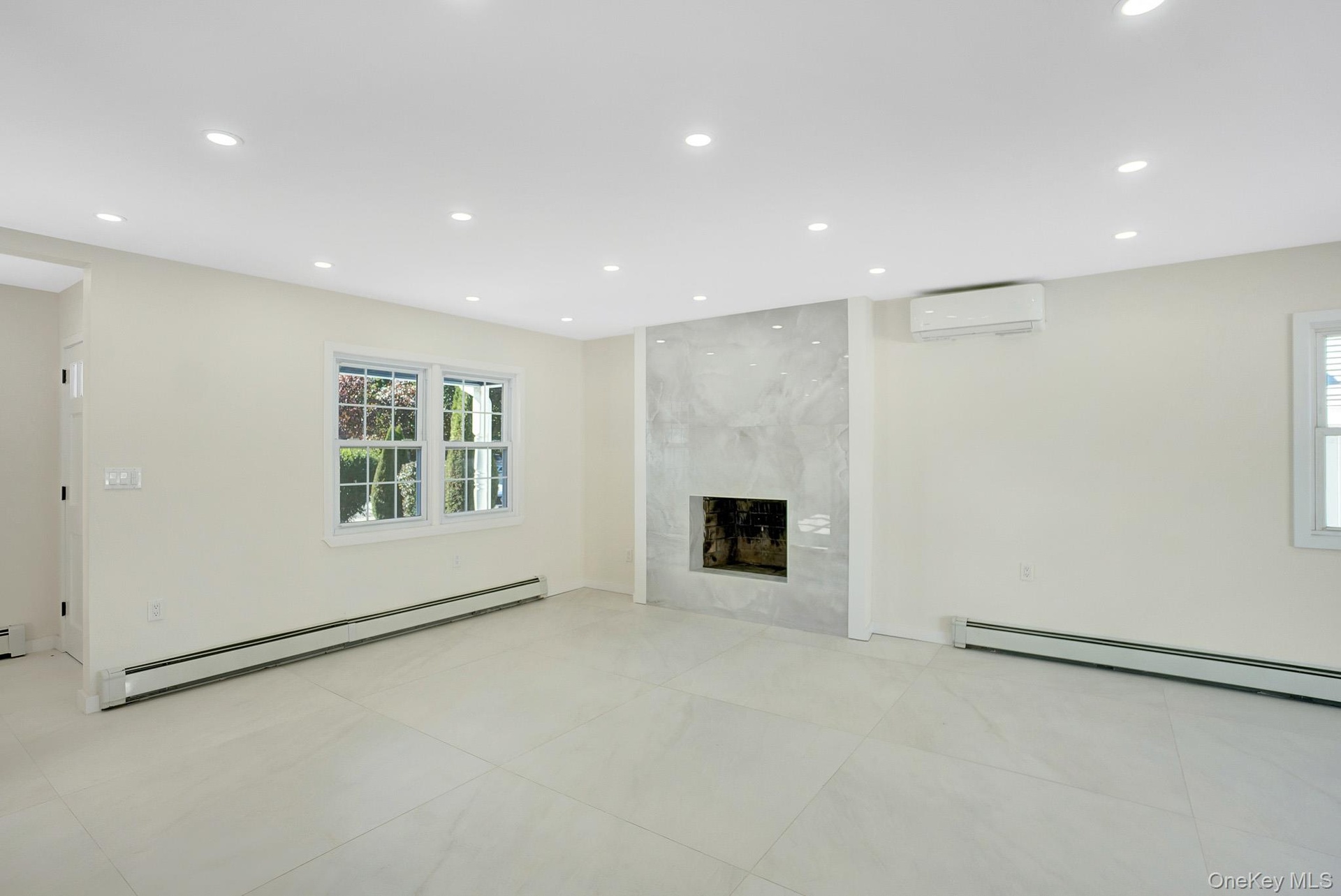 - Unfurnished living room with baseboard heating, recessed lighting, healthy amount of natural light, a high end fireplace, and an AC wall unit