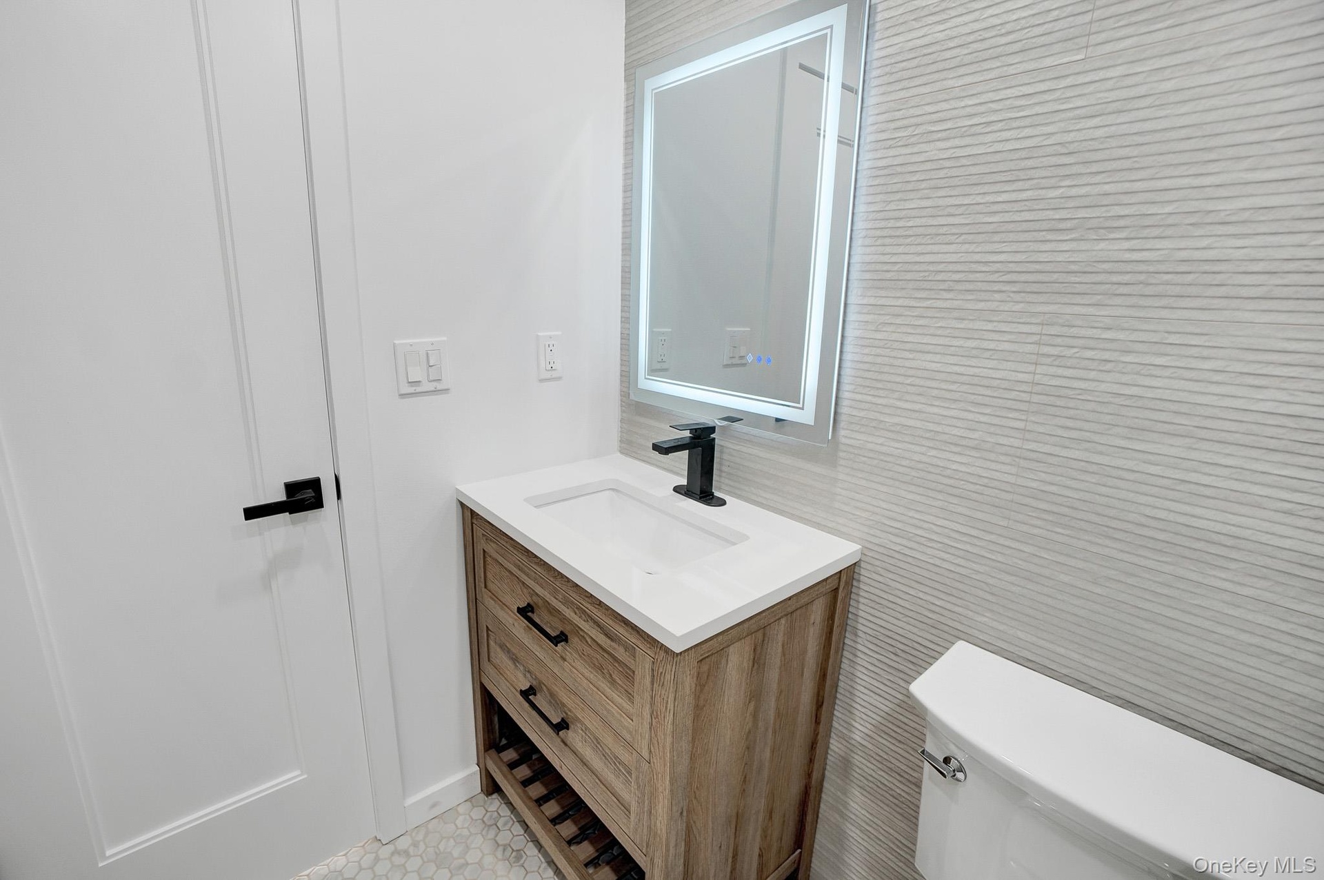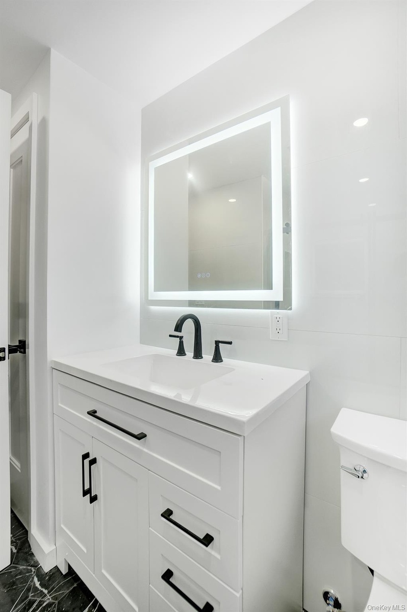 - Half bath featuring vanity, dark marble finish flooring, and recessed lighting