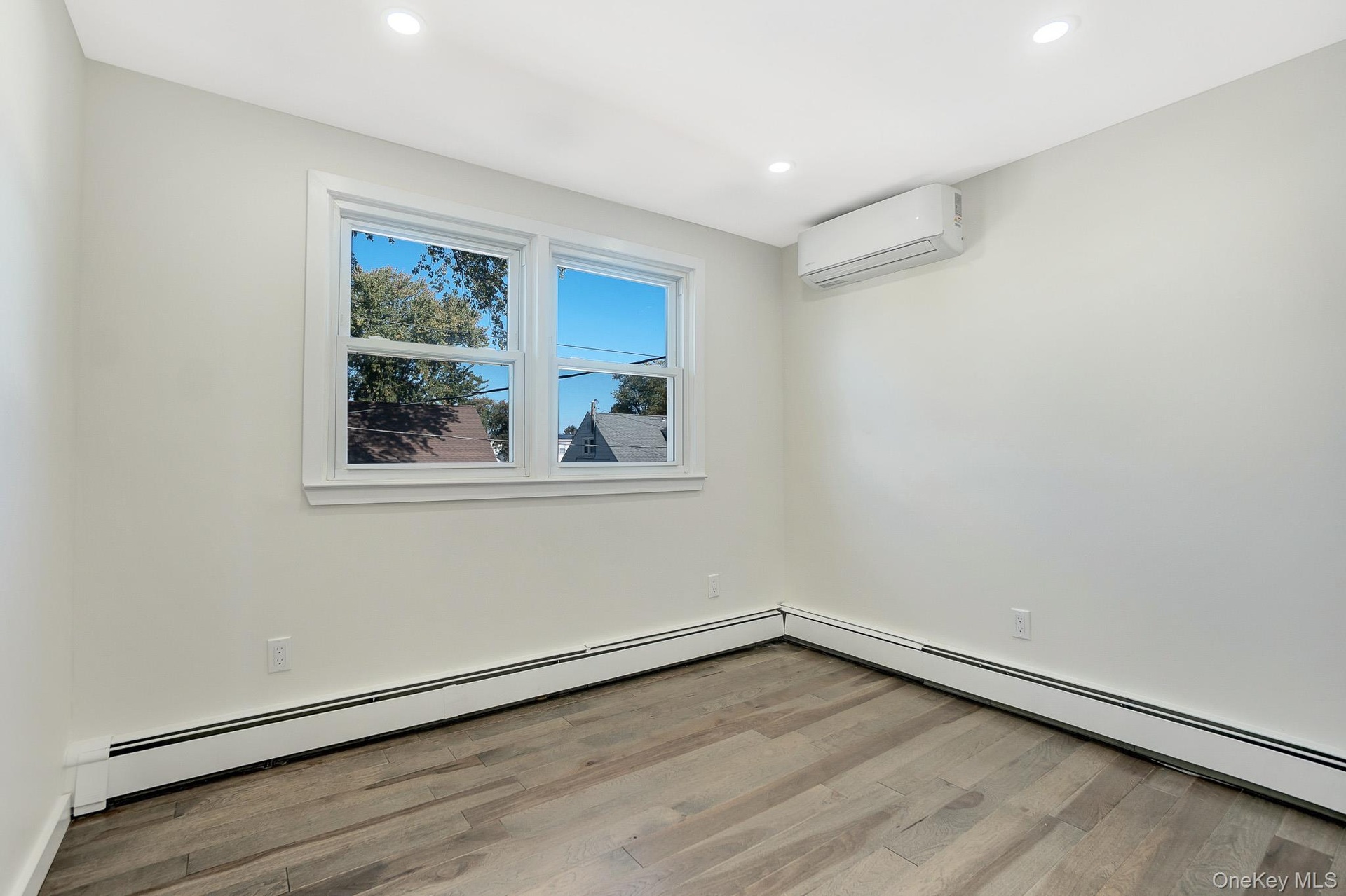 - Unfurnished room with a baseboard radiator, light wood-style floors, a wall mounted air conditioner, and recessed lighting