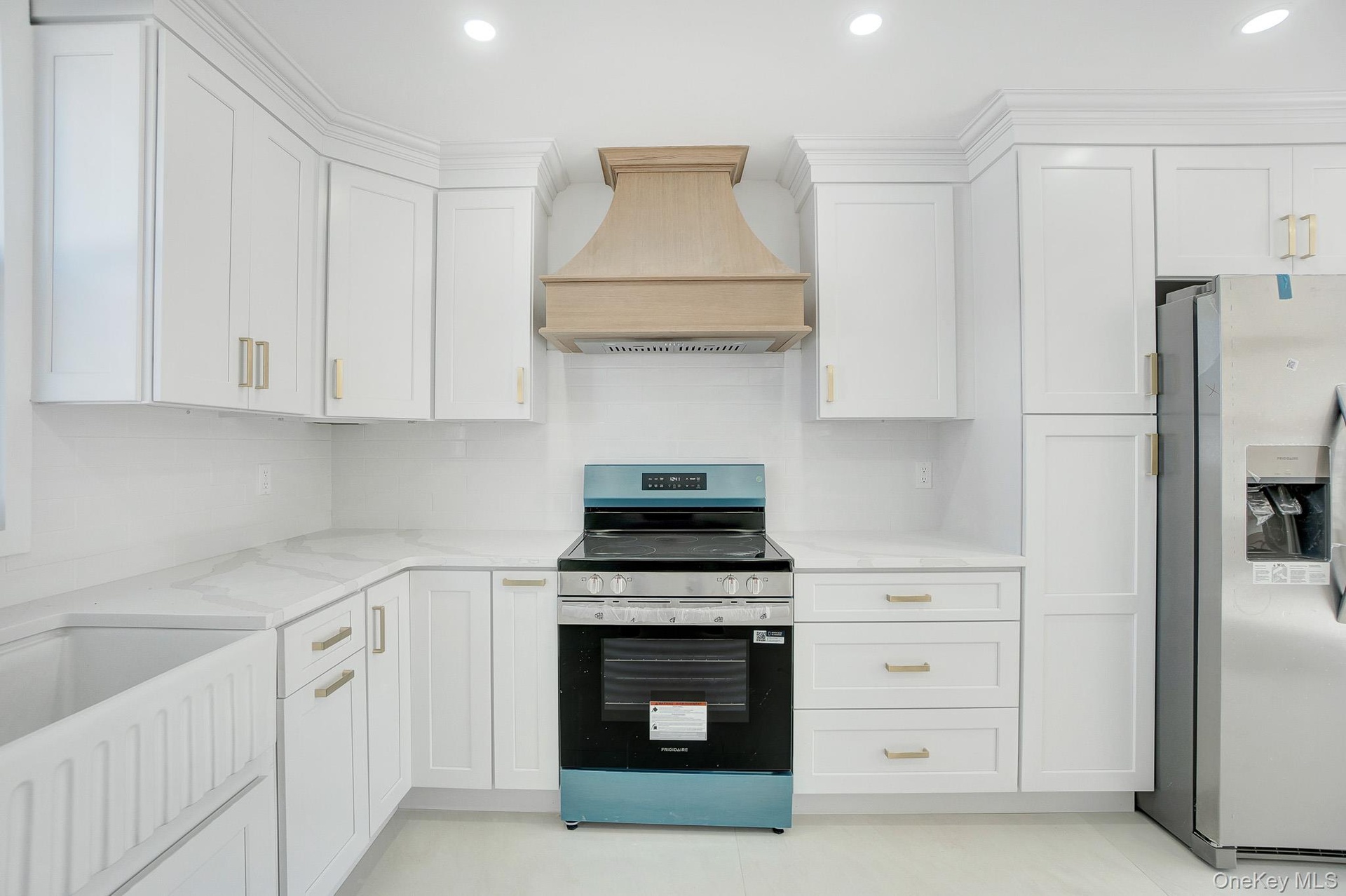 - Kitchen with appliances with stainless steel finishes, custom range hood, white cabinets, light stone counters, and tasteful backsplash