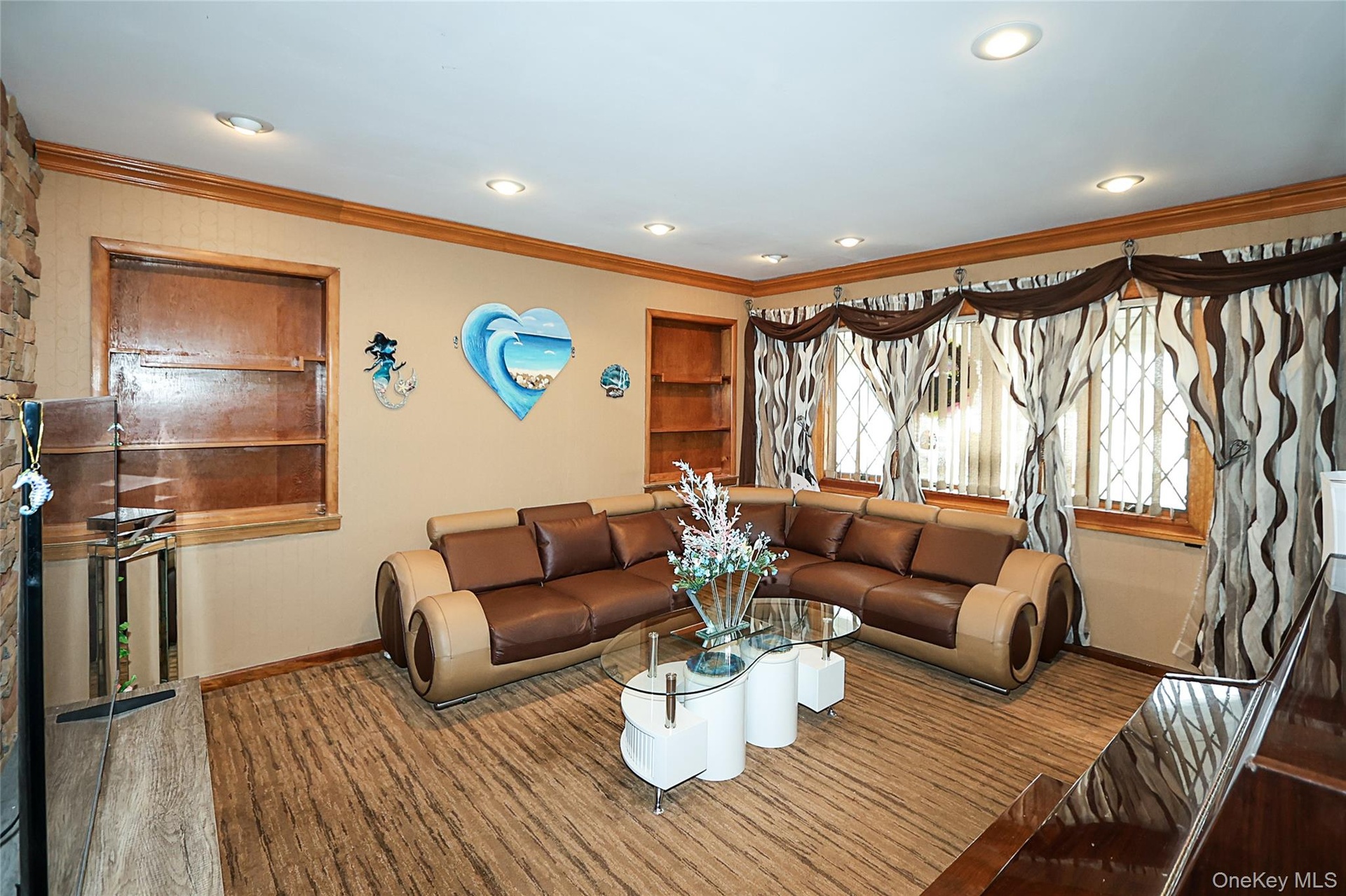 - Living room with recessed lighting, ornamental molding, and wood finished floors