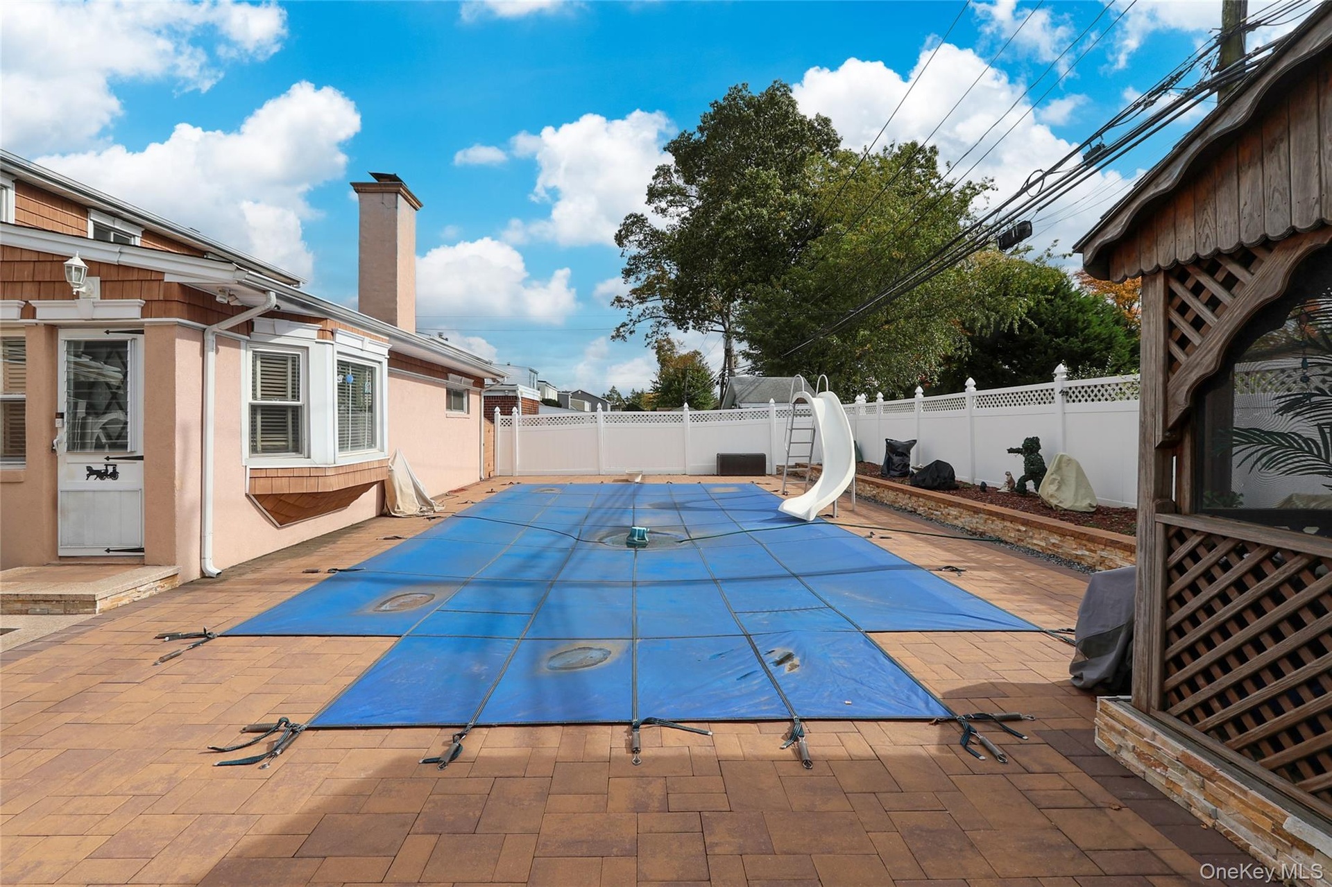 - View of swimming pool featuring a water slide, a patio, and a fenced backyard