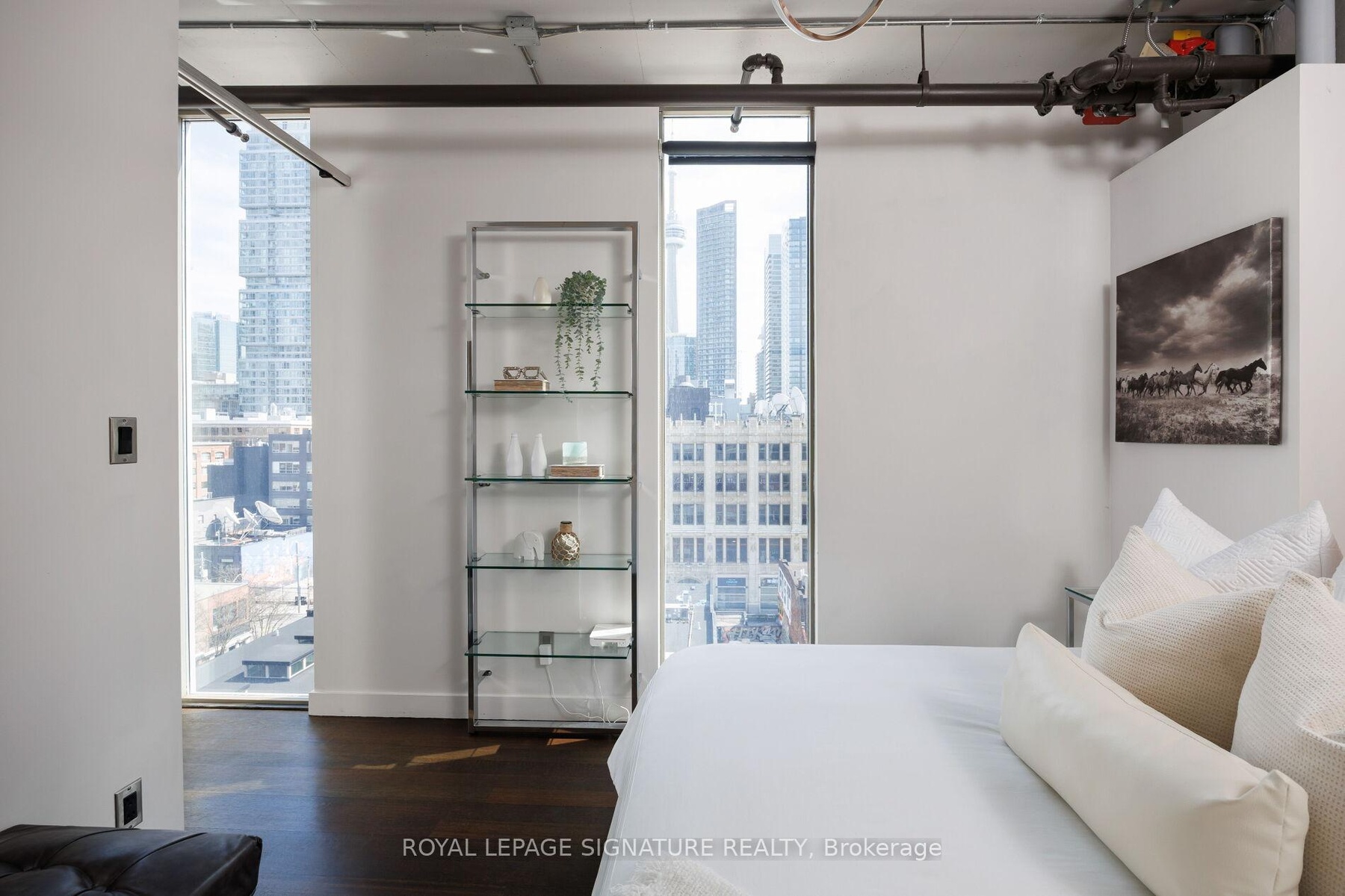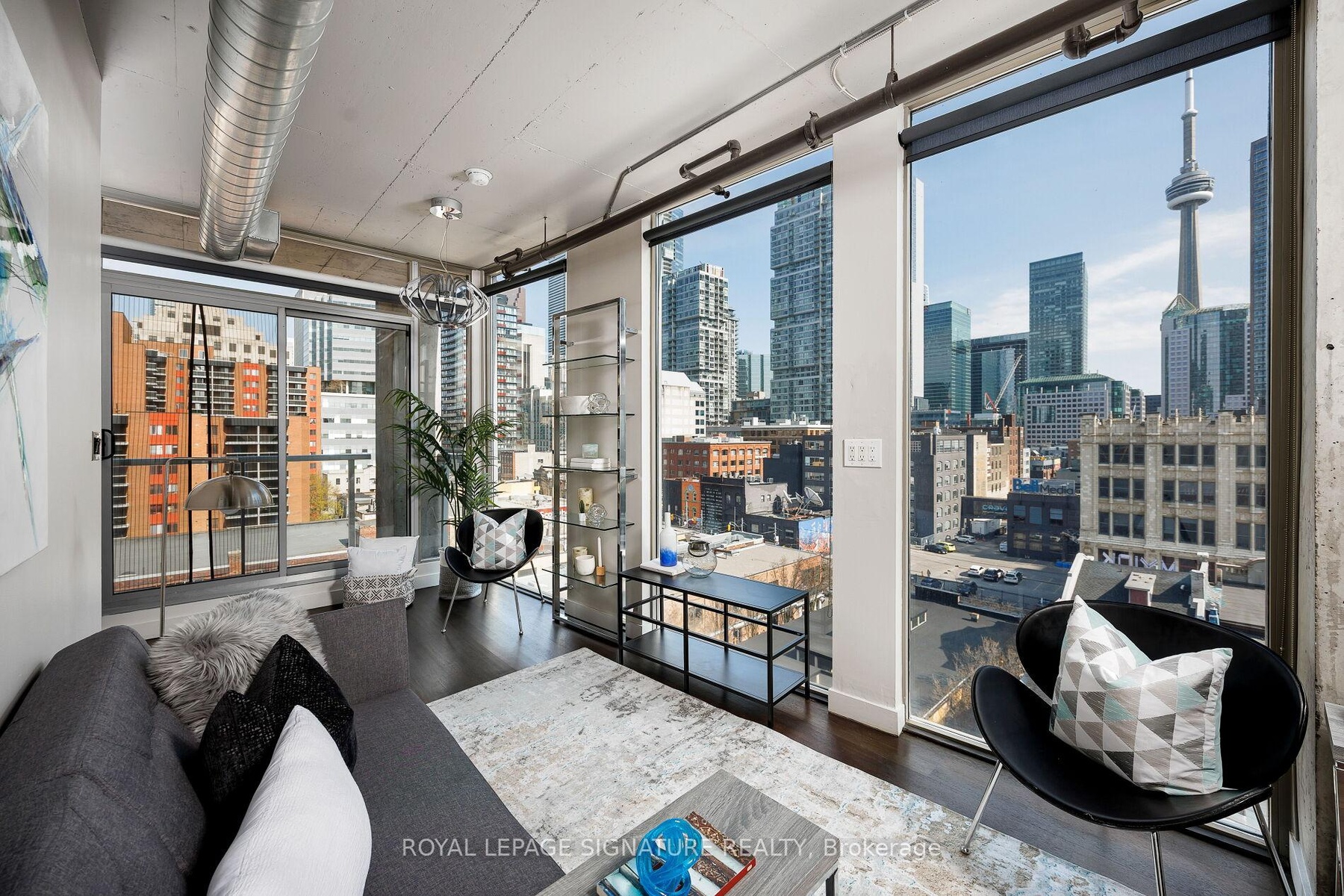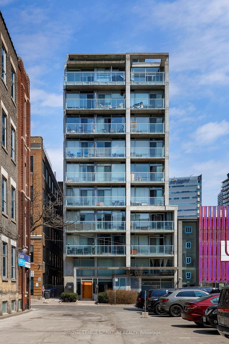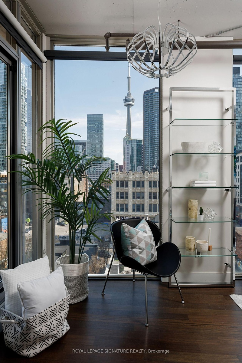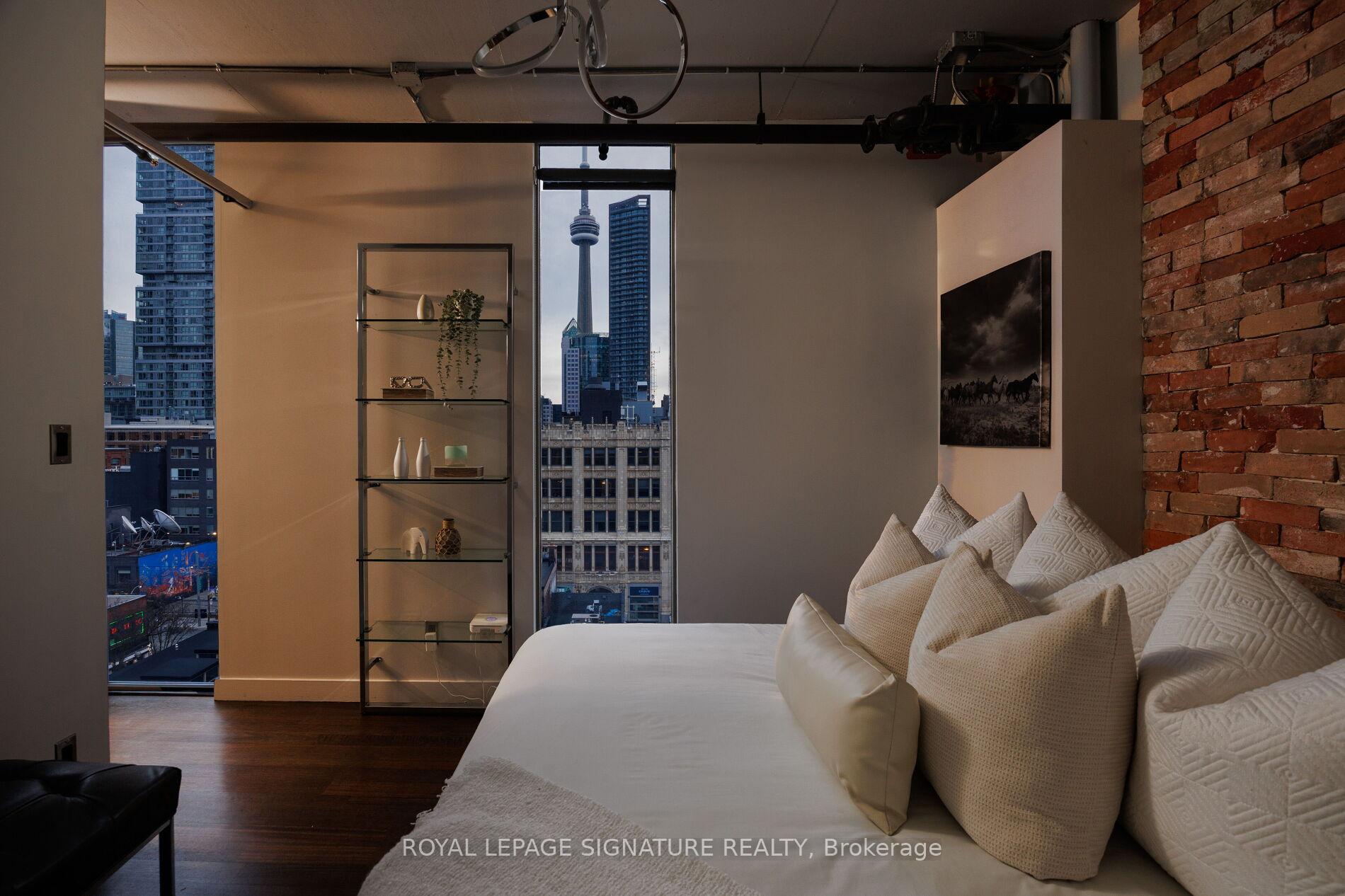 Elevate your everyday in this jaw-dropping 2-bedroom, 2-bathroom designer loft at One Six Nine Lofts where luxury meets art in the heart of downtown Toronto. With 1,047 square feet of impeccably curated space, this rare offering delivers the ultimate in modern urban living. Massive full-length windows frame stunning, unobstructed views of the CN Tower and city skyline, flooding the home with natural light. Step inside and be captivated by industrial-chic elements: exposed concrete ceilings, rich hardwood floors, and sleek imported Italian cabinetry. Brand-new tiles, modern cabinetry, upgraded fixtures, and upscale designer lighting elevate the space with a fresh, modern edge. The open-concept layout, soaring 10-foot ceilings, and chef-inspired kitchen make entertaining effortless and unforgettable. Plus, a fully refurbished HVAC system (completed in 2023) ensures year-round comfort and efficiency. The expansive primary suite offers a true urban retreat, complete with a spa-like ensuite, custom-designed closets, and a stunning mural by internationally acclaimed artist Alex Turco. The spacious 2nd bedroom easily fits a king size bed, while the large balcony provides practical outdoor space. All these features creates a bold, sophisticated backdrop that makes this loft truly one-of-a-kind. Innovation meets convenience with a cutting-edge parking stacker system exclusive to residents. Set within a boutique building of just 45 unique suites, this address places you steps from Toronto's cultural pulse TIFF Bell Lightbox, premier dining, boutique shopping, and vibrant nightlife are all at your doorstep.This is more than a loft its a statement. Secure your place among Toronto's finest.