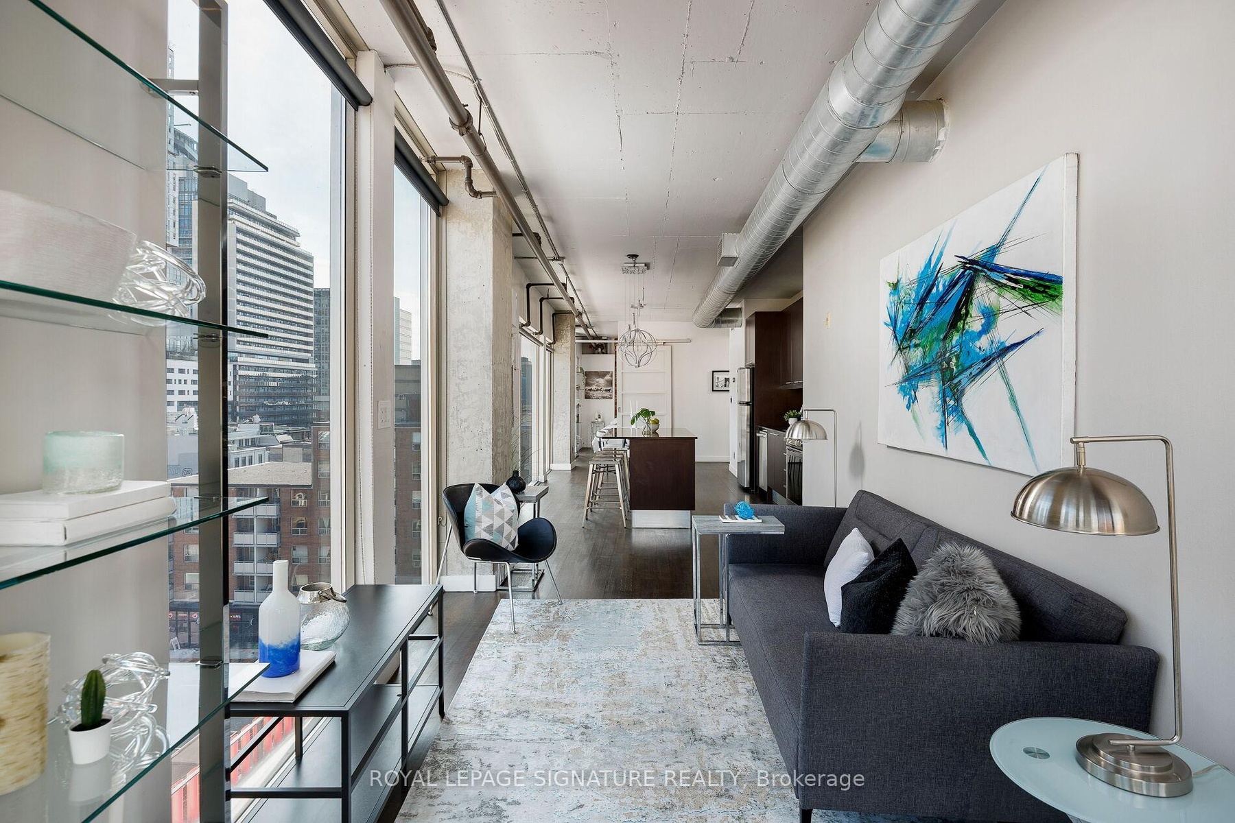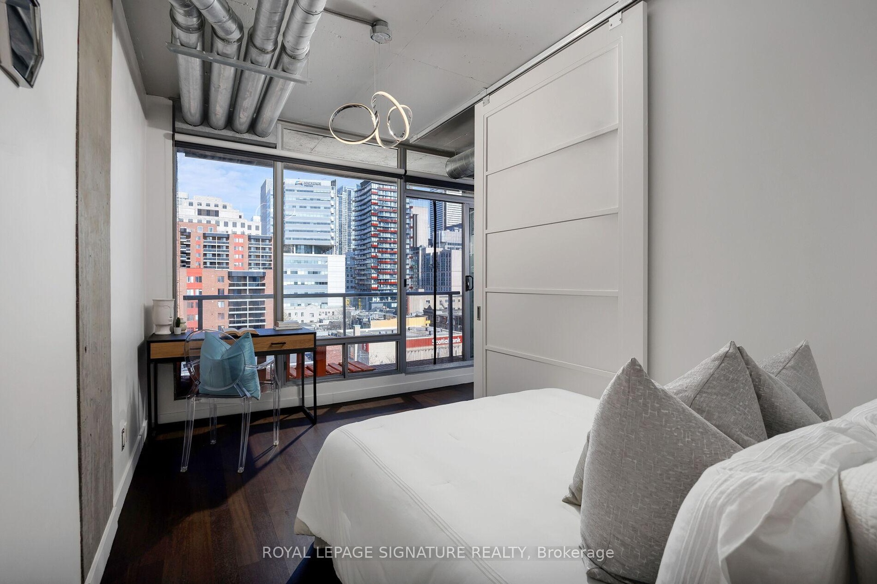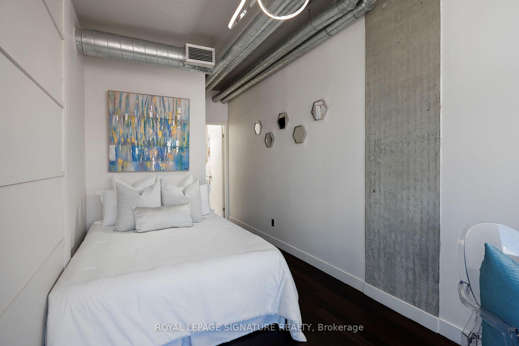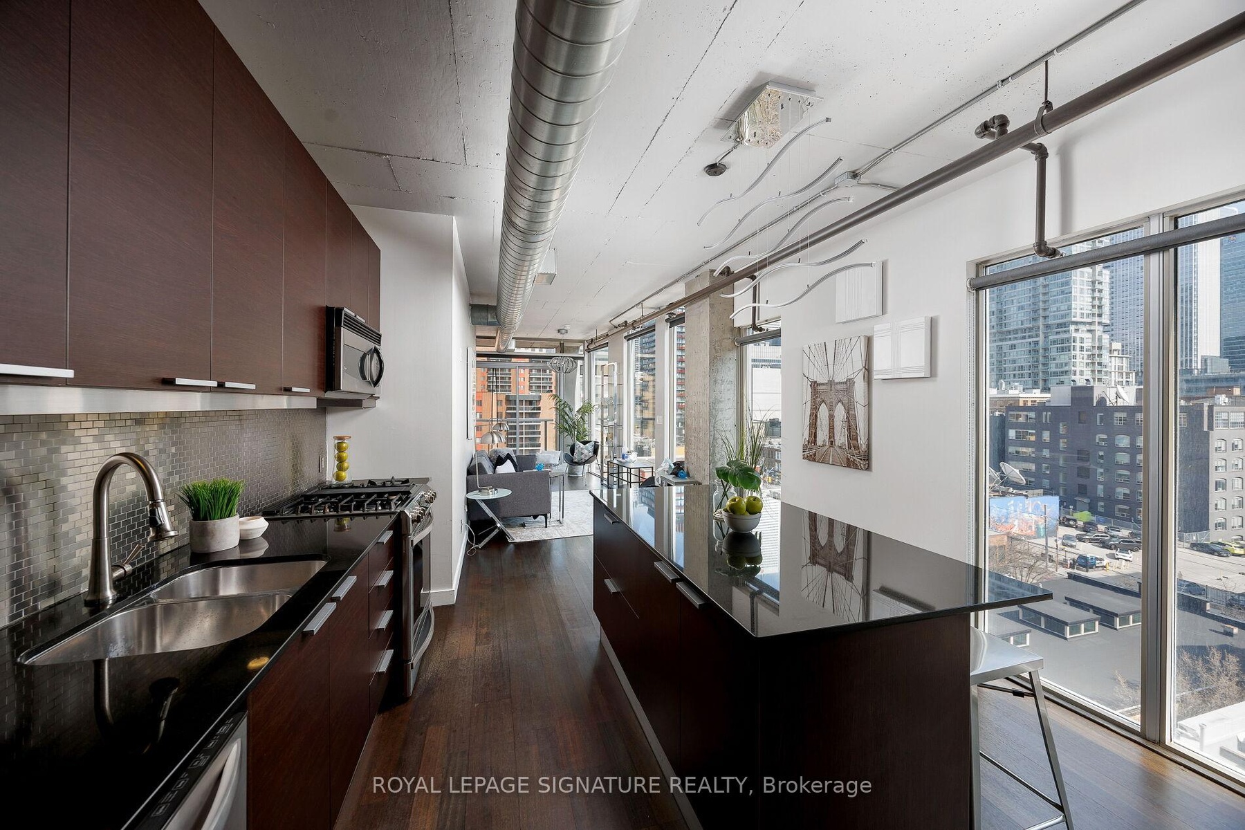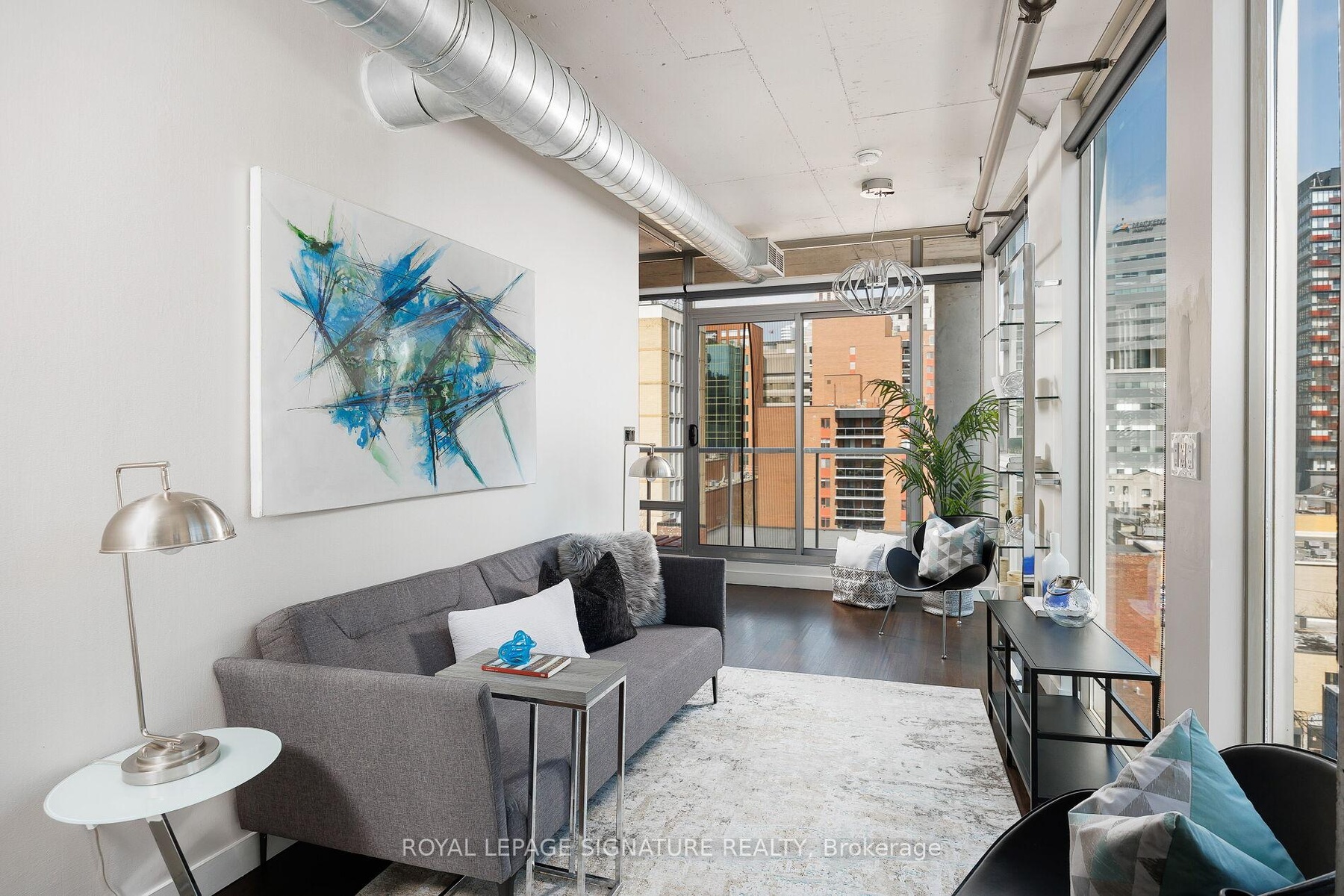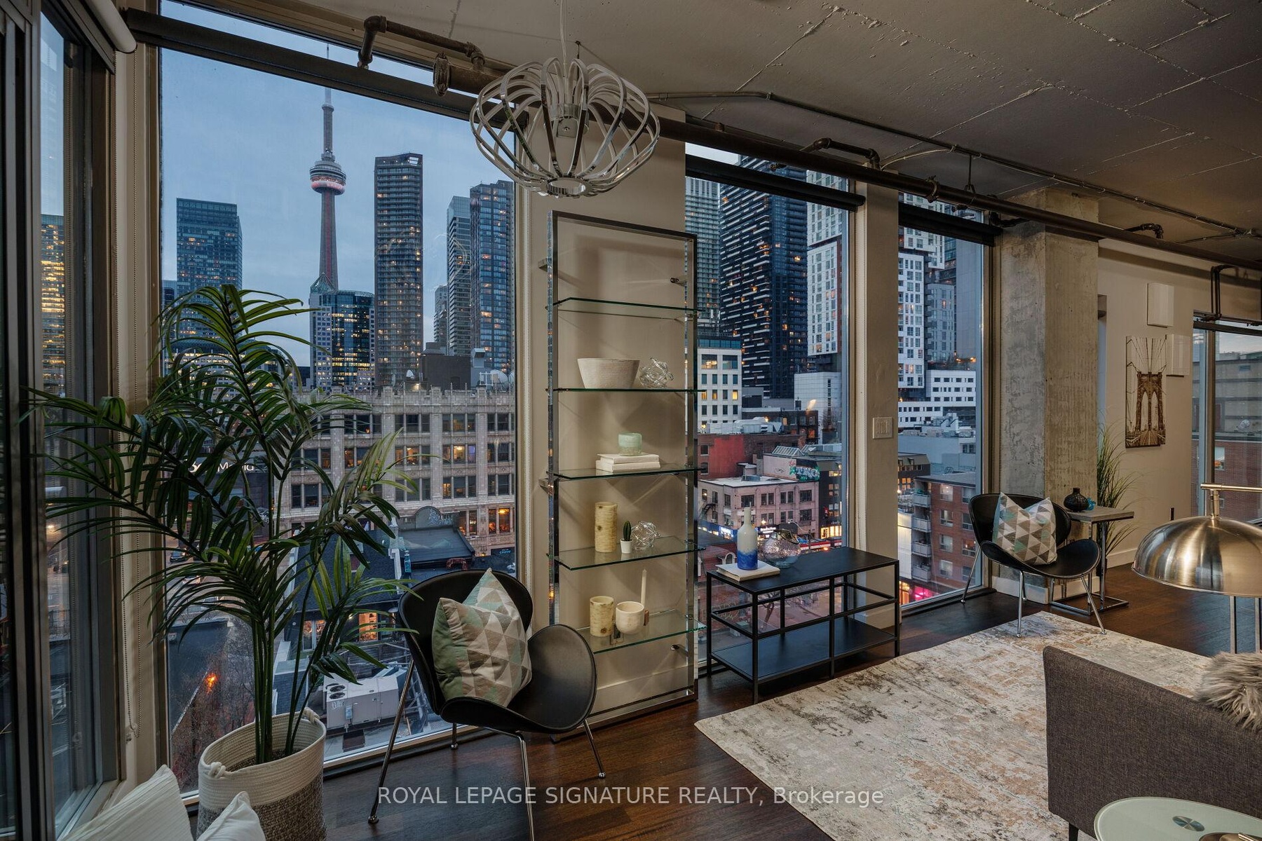 Elevate your everyday in this jaw-dropping 2-bedroom, 2-bathroom designer loft at One Six Nine Lofts where luxury meets art in the heart of downtown Toronto. With 1,047 square feet of impeccably curated space, this rare offering delivers the ultimate in modern urban living. Massive full-length windows frame stunning, unobstructed views of the CN Tower and city skyline, flooding the home with natural light. Step inside and be captivated by industrial-chic elements: exposed concrete ceilings, rich hardwood floors, and sleek imported Italian cabinetry. Brand-new tiles, modern cabinetry, upgraded fixtures, and upscale designer lighting elevate the space with a fresh, modern edge. The open-concept layout, soaring 10-foot ceilings, and chef-inspired kitchen make entertaining effortless and unforgettable. Plus, a fully refurbished HVAC system (completed in 2023) ensures year-round comfort and efficiency. The expansive primary suite offers a true urban retreat, complete with a spa-like ensuite, custom-designed closets, and a stunning mural by internationally acclaimed artist Alex Turco. The spacious 2nd bedroom easily fits a king size bed, while the large balcony provides practical outdoor space. All these features creates a bold, sophisticated backdrop that makes this loft truly one-of-a-kind. Innovation meets convenience with a cutting-edge parking stacker system exclusive to residents. Set within a boutique building of just 45 unique suites, this address places you steps from Toronto's cultural pulse TIFF Bell Lightbox, premier dining, boutique shopping, and vibrant nightlife are all at your doorstep.This is more than a loft its a statement. Secure your place among Toronto's finest.