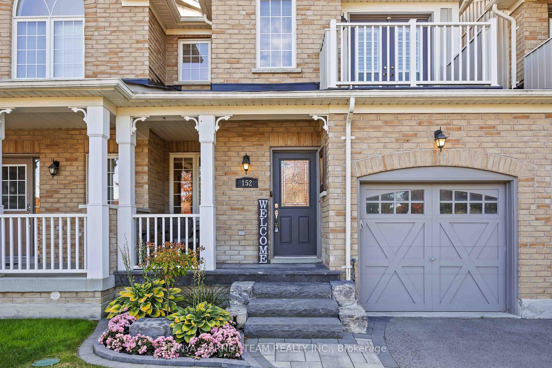 Beautifully upgraded freehold townhome nestled in one of Brooklin's most sought after communities! This stunning 3 bedroom, 3 bath townhome offers the perfect blend of comfort, style & convenience with garage access to a private backyard & a walk-out basement - this home is designed for modern living. From the moment you arrive, you'll be greeted by a beautifully landscaped front featuring a custom interlocking walkway, irrigation system, natural stone steps & a charming front porch - the perfect spot to enjoy your morning coffee! Step inside to a sun-filled, open concept main floor adorned with gleaming hardwood floors, elegant california shutters & spacious principal rooms ideal for entertaining. The formal living & dining rooms offer a sophisticated setting for gatherings, while the cozy family room features a stunning custom stone gas fireplace & large picture window overlooking the backyard. The heart of the home, a family-sized kitchen boasts a large centre island with breakfast bar, stainless steel appliances, ceramic floors & a bright breakfast area with a walk-out to the raised deck. Enjoy summer barbecues with ease thanks to the built-in gas BBQ hookup & yard views. Upstairs, you'll find 3 generous bedrooms & a convenient study nook - ideal for homework or home office. The primary suite is a true retreat with a walk-in closet featuring custom organizers & a luxurious 4pc ensuite with a soaker tub. The 2nd bedroom offers its own walk-in closet & a walk-out to a private balcony overlooking the front gardens. Unspoiled walk-out basement offers incredible potential with a large above grade window, laundry area, rough-in for a bathroom, ample storage & direct access to the backyard patio & 8x12 garden shed. Located just steps from schools, parks & with easy access to Highway 407, this is a rare opportunity to own a beautifully maintained home in a family-friendly neighbourhood. Don't miss your chance to call 152 Shrewsbury Drive home!