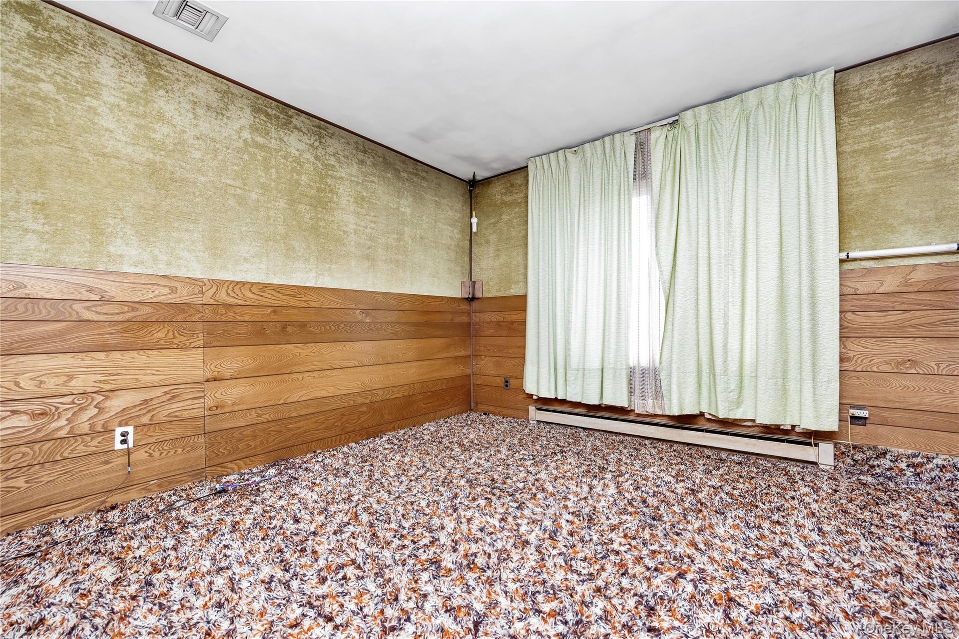 - Carpeted living area featuring wooden walls, beam ceiling, baseboard heating, and high vaulted ceiling