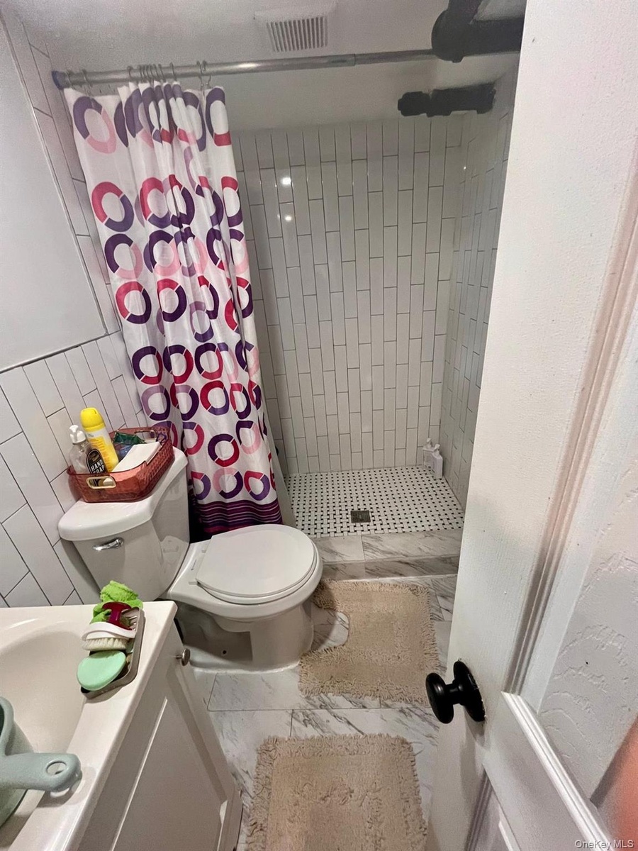- Full bathroom featuring a shower stall, marble look tile flooring, vanity, and tile walls