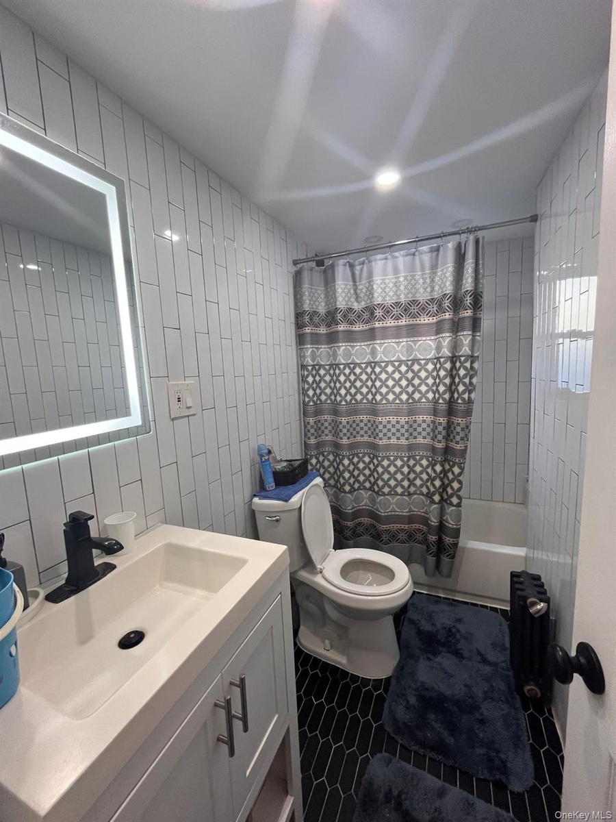 - Full bathroom with tile walls, shower / tub combo with curtain, radiator, vanity, and dark tile patterned flooring