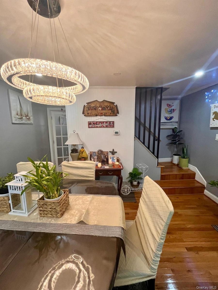 - Dining room with wood finished floors, stairway, crown molding, and a chandelier