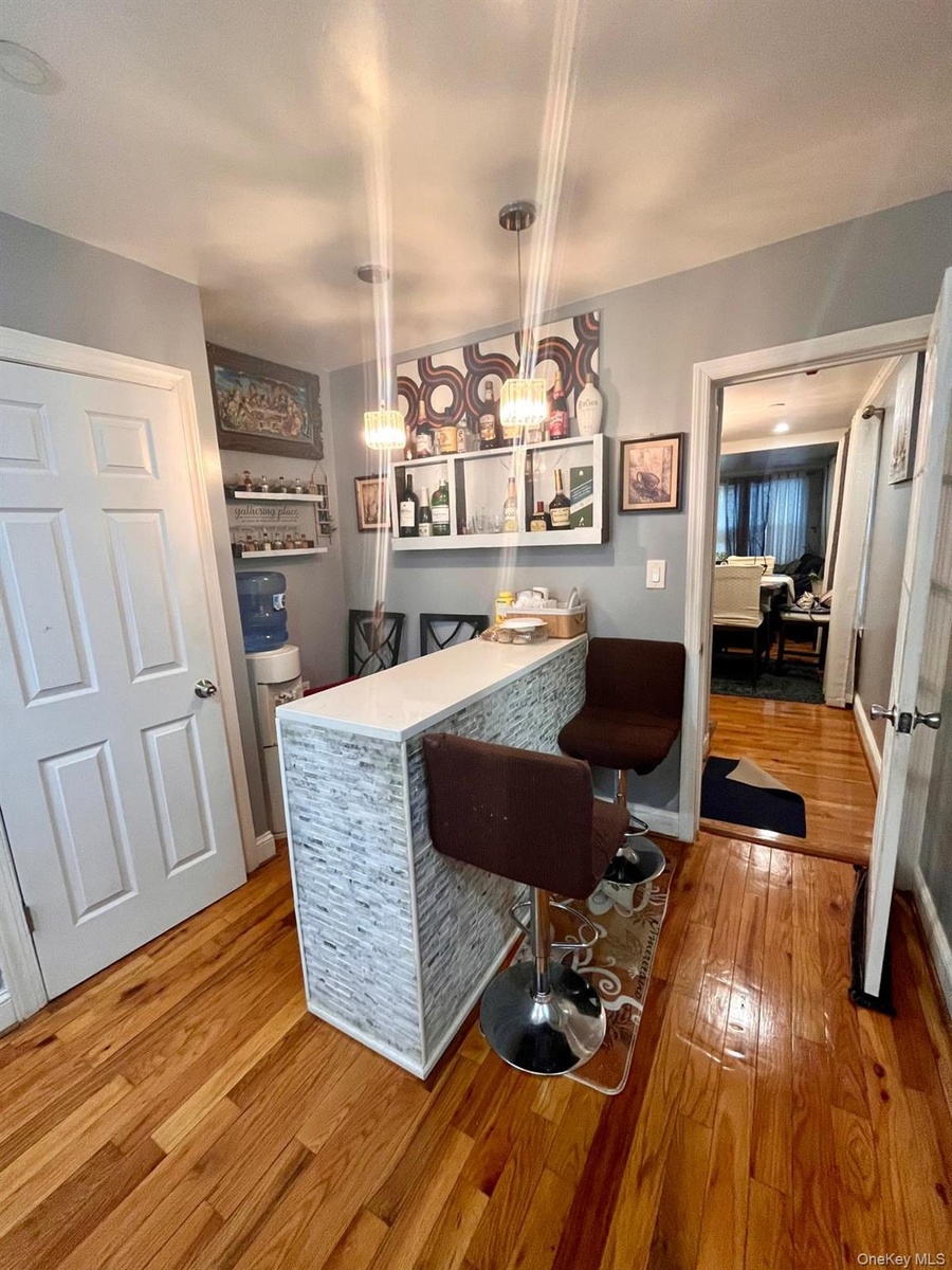 - Bar featuring light wood-style floors, hanging light fixtures, and open shelves