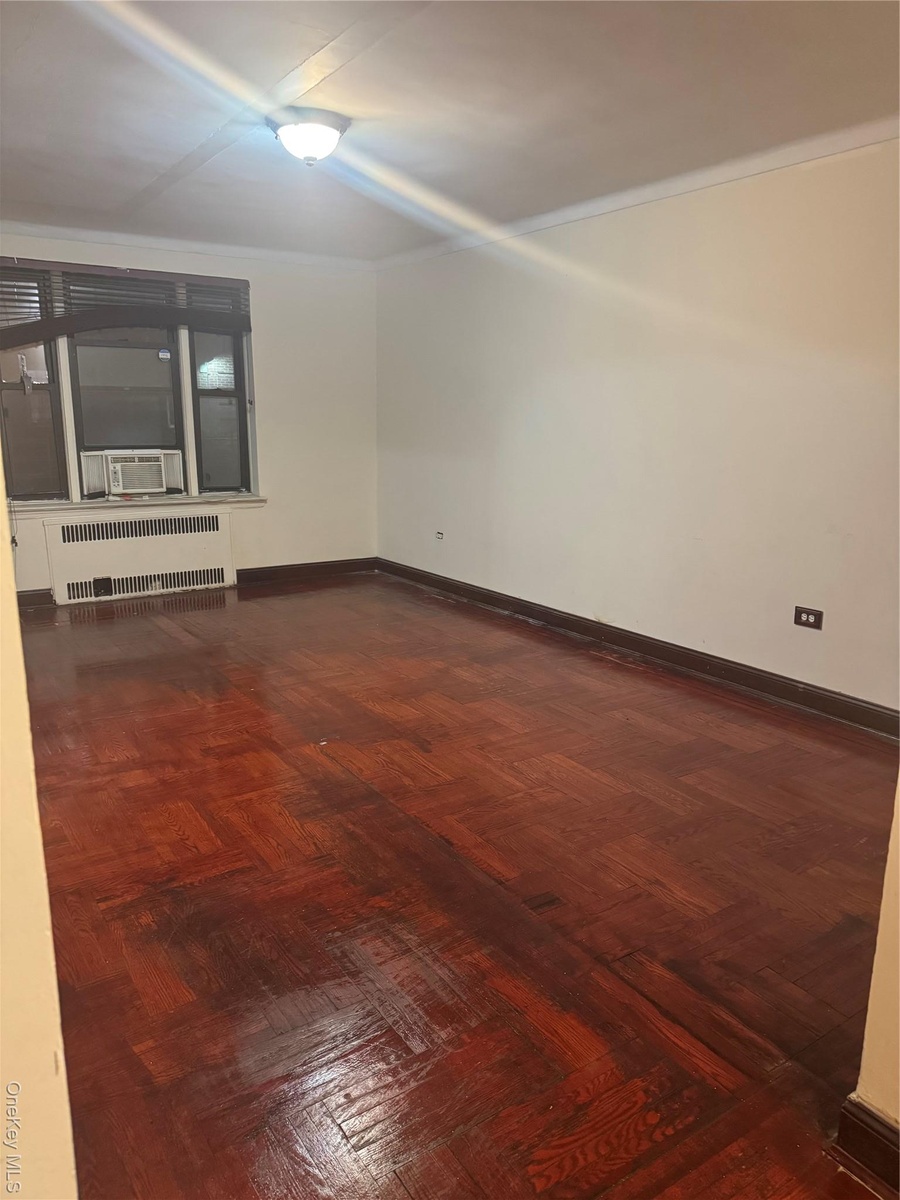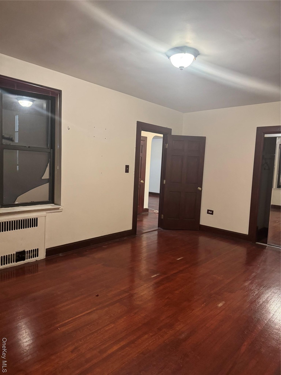 - Unfurnished room with dark wood finished floors and radiator heating unit