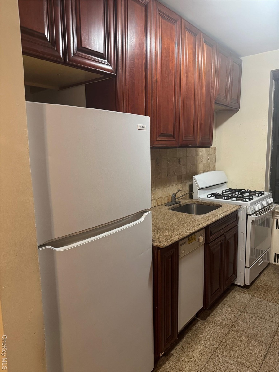 - Kitchen with white refrigerator, stove, decorative backsplash, light stone countertops, and granite floors