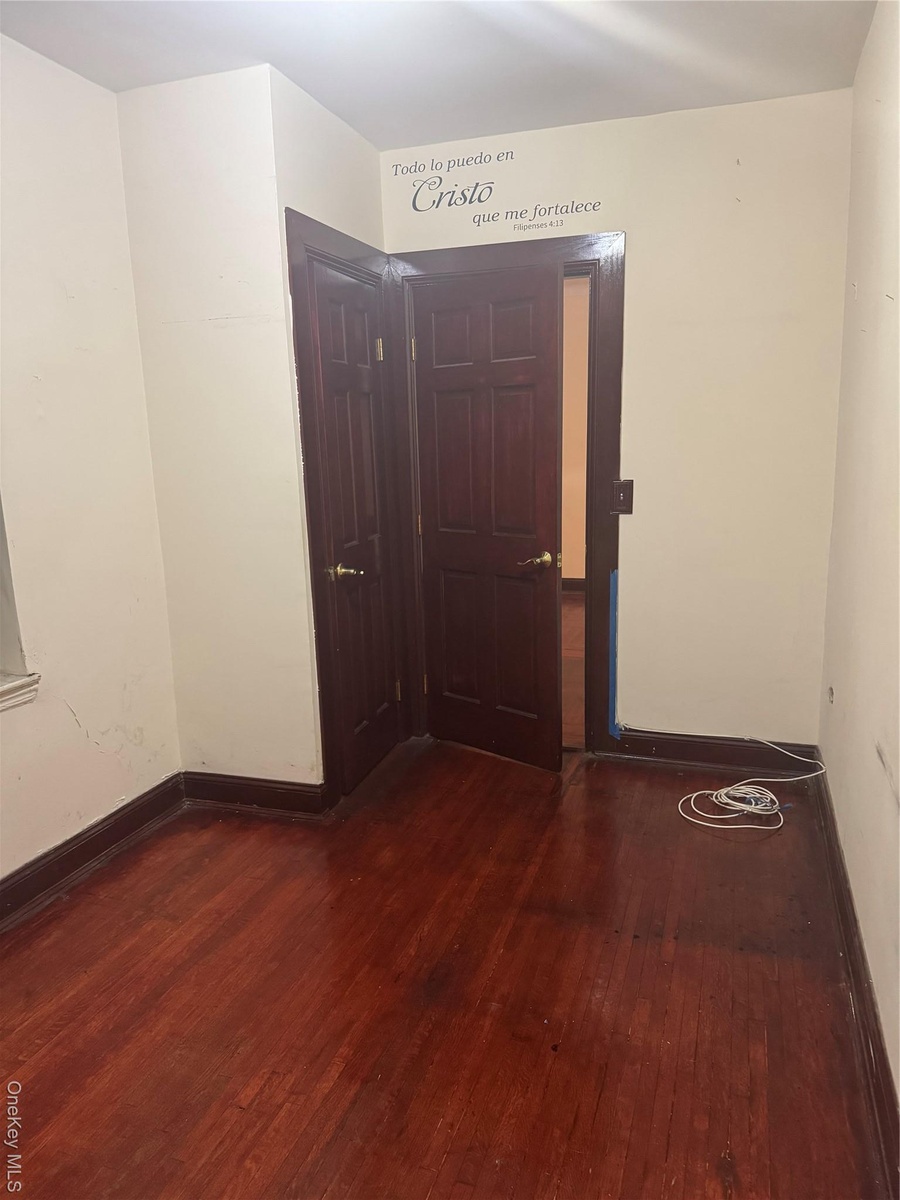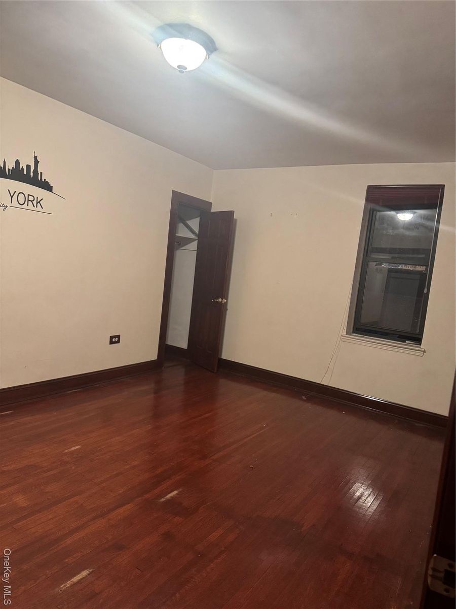 - Unfurnished room featuring dark wood-style floors and baseboards