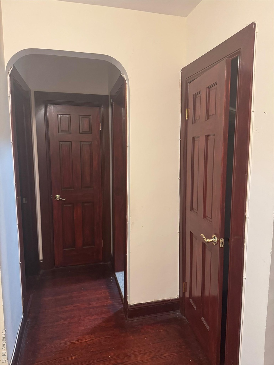 - Hall with dark wood finished floors, arched walkways, and radiator heating unit