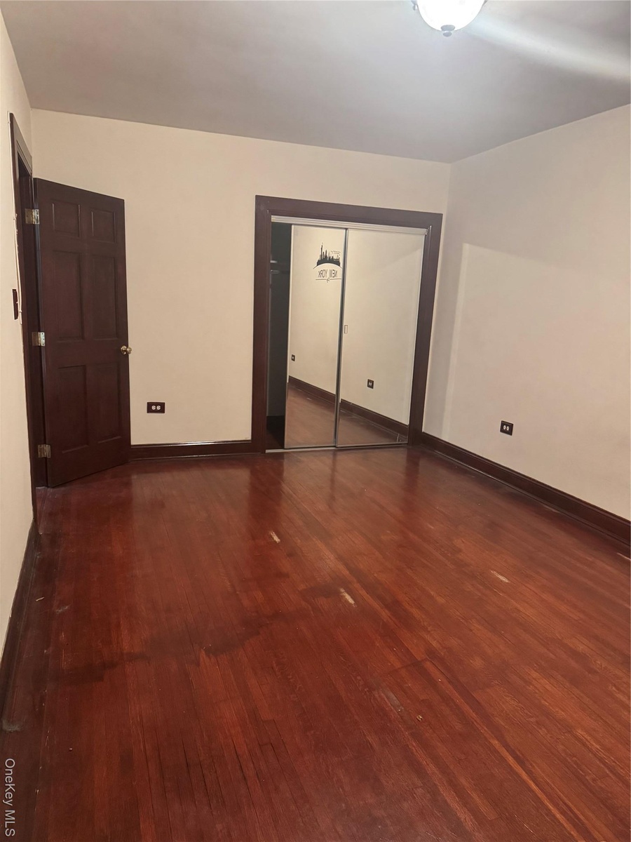 - Unfurnished bedroom with dark wood-style floors and a closet