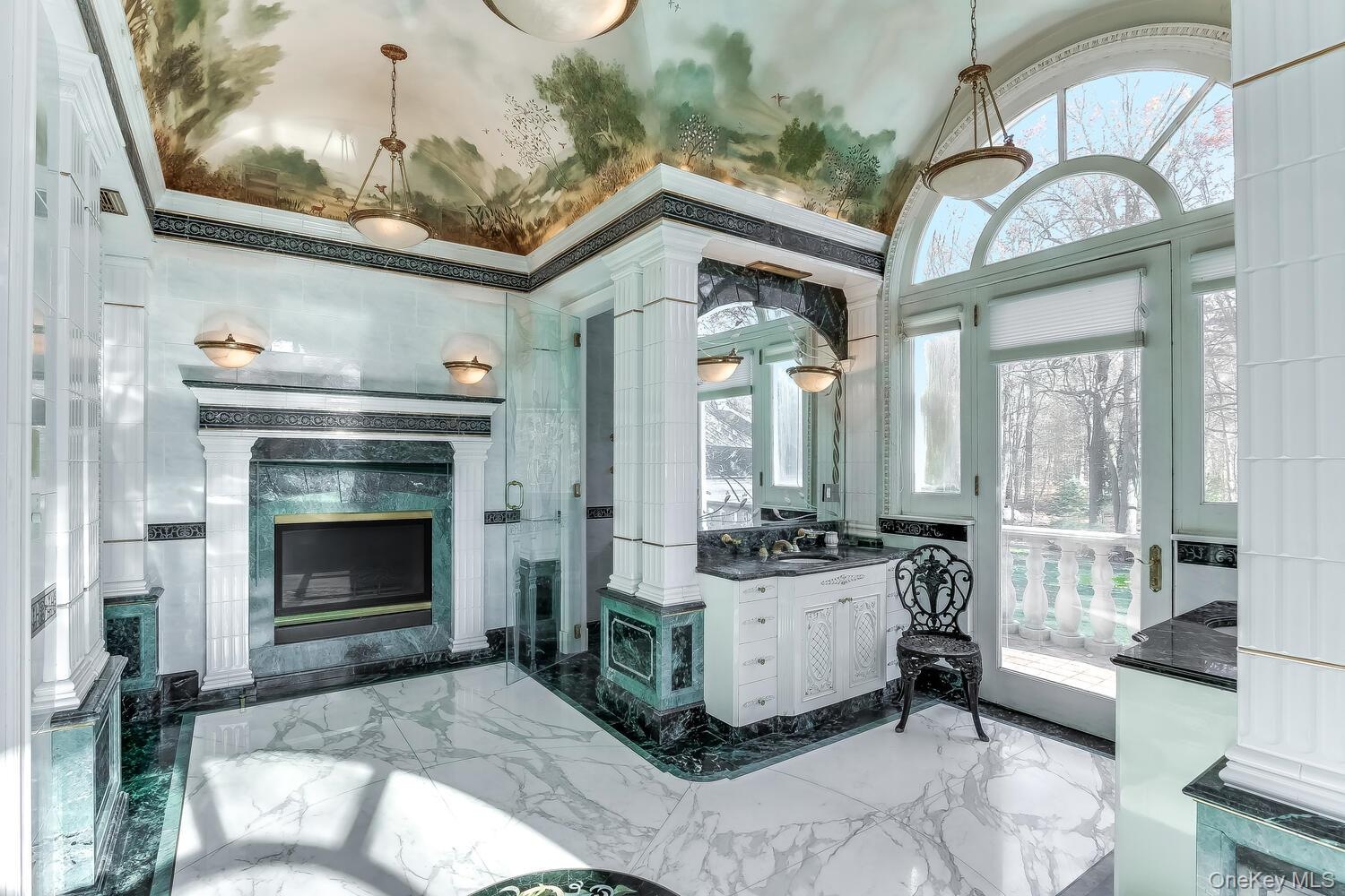 Upstairs, the palatial primary suite is a private retreat with his ‘n hers dressing rooms crafted of mirrors and mahogany and a spa-inspired bath complete with wet-and-dry saunas and grand soaking tub. Cove lighting and  barrel vaulted hand-painted ceilings  add ambience and luxury.