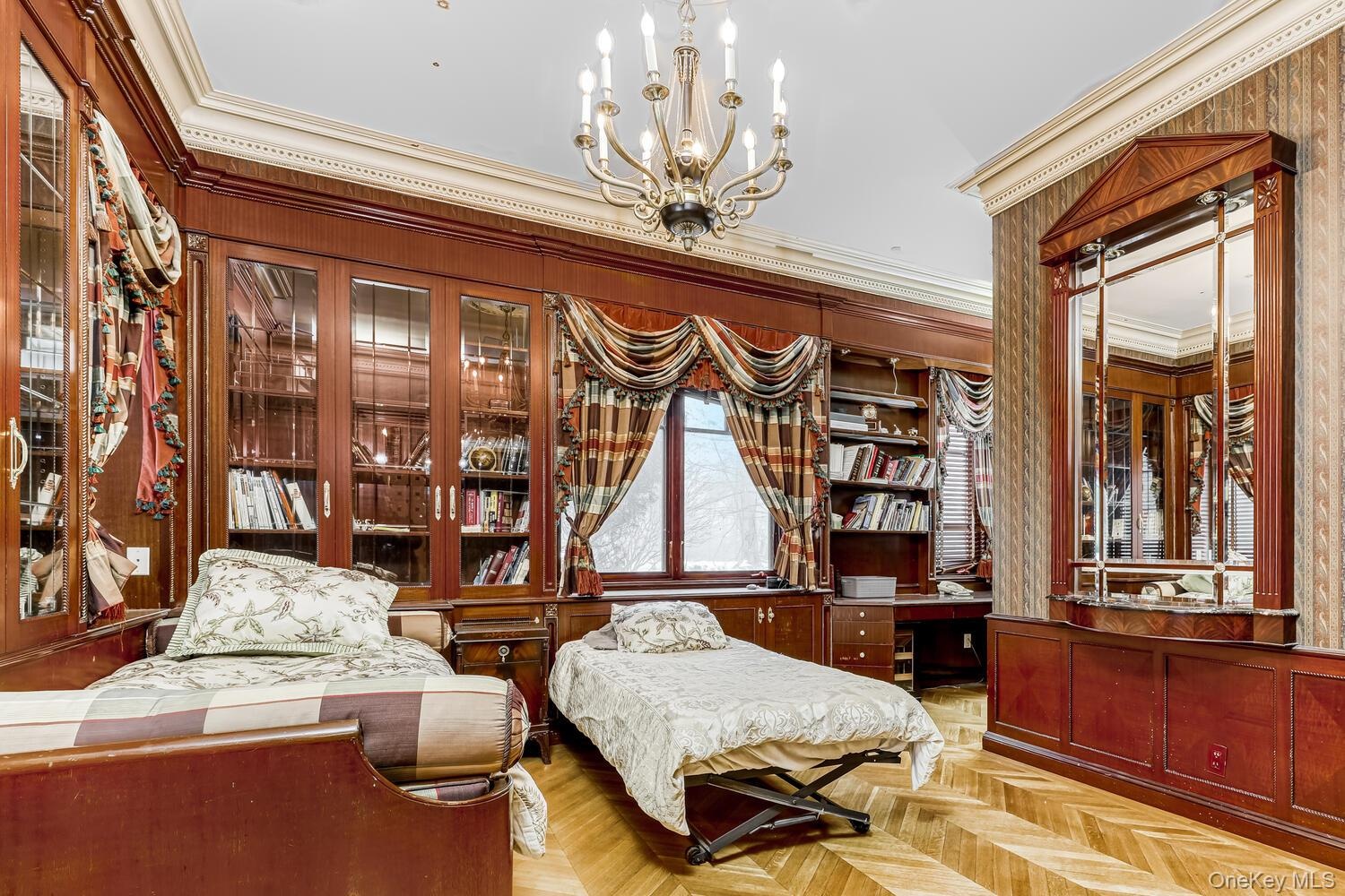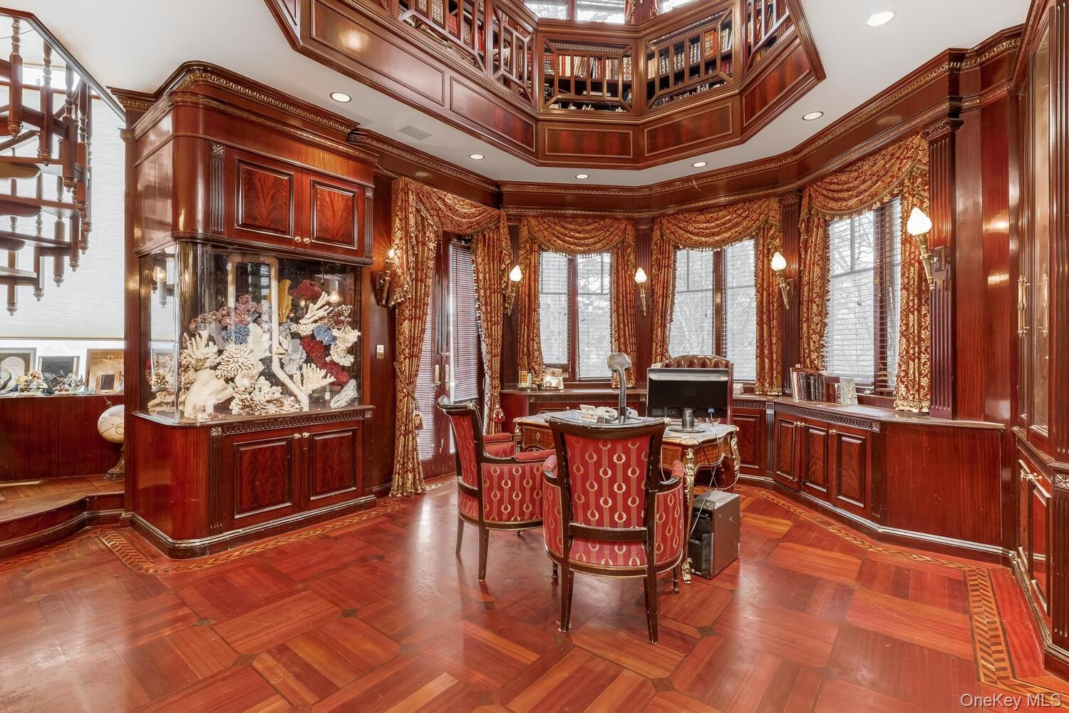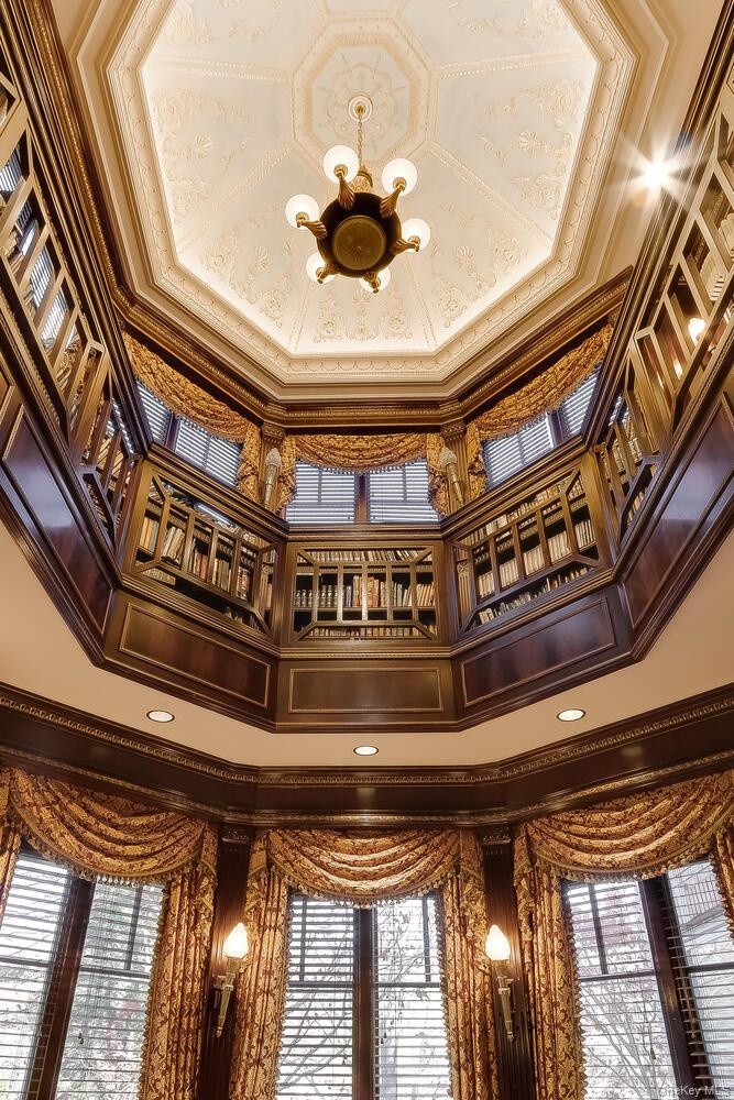 - Richly fabricated wood library features floor-to-ceiling bookshelves