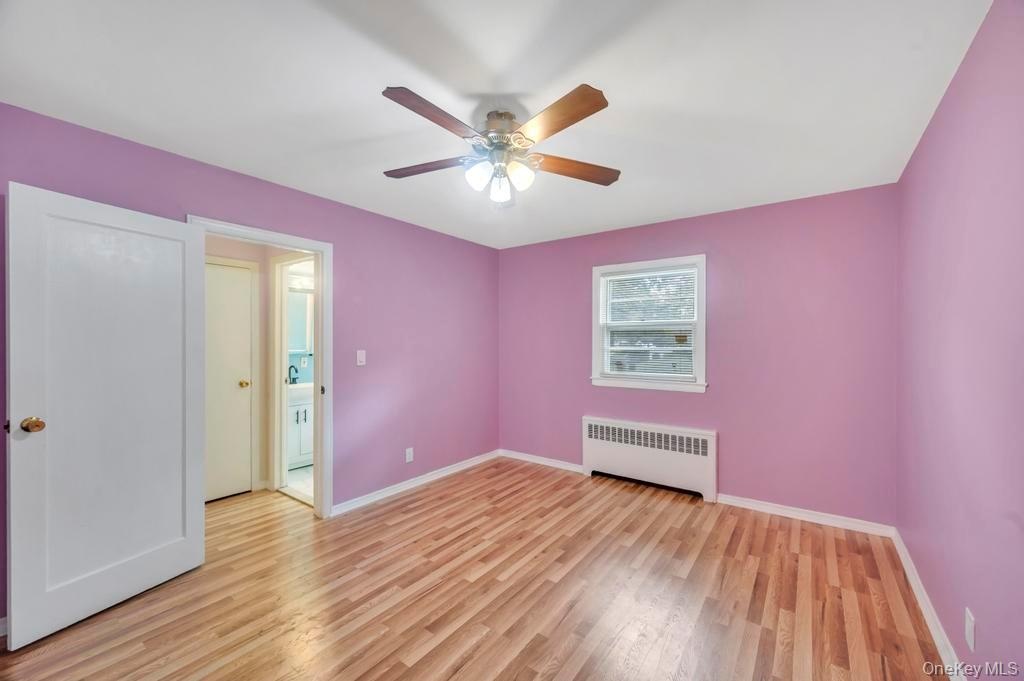 - Unfurnished bedroom featuring radiator, light wood-style floors, and ceiling fan