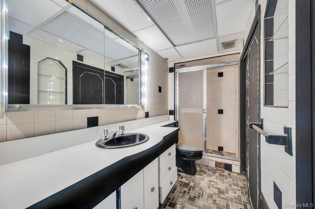 - Full bath with a stall shower, tile walls, vanity, a drop ceiling, and tasteful backsplash