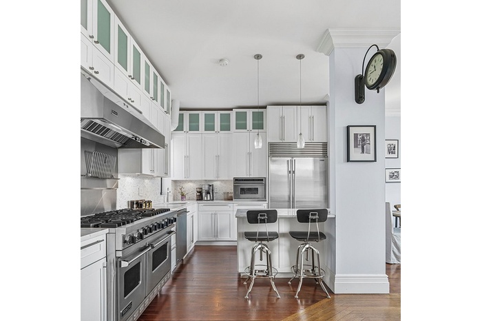 The Chef’s kitchen featuring top-of-the-line stainless-steel appliances, a chef’s oven, extra overheard cabinet space for added storage, and an island with seating for two.