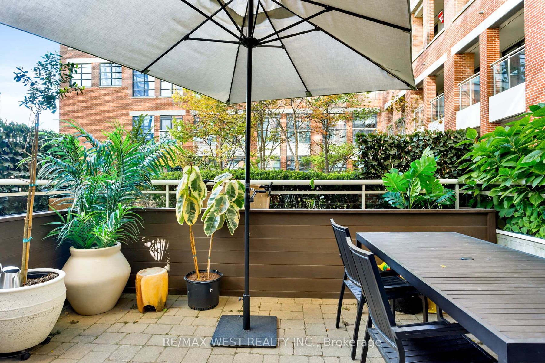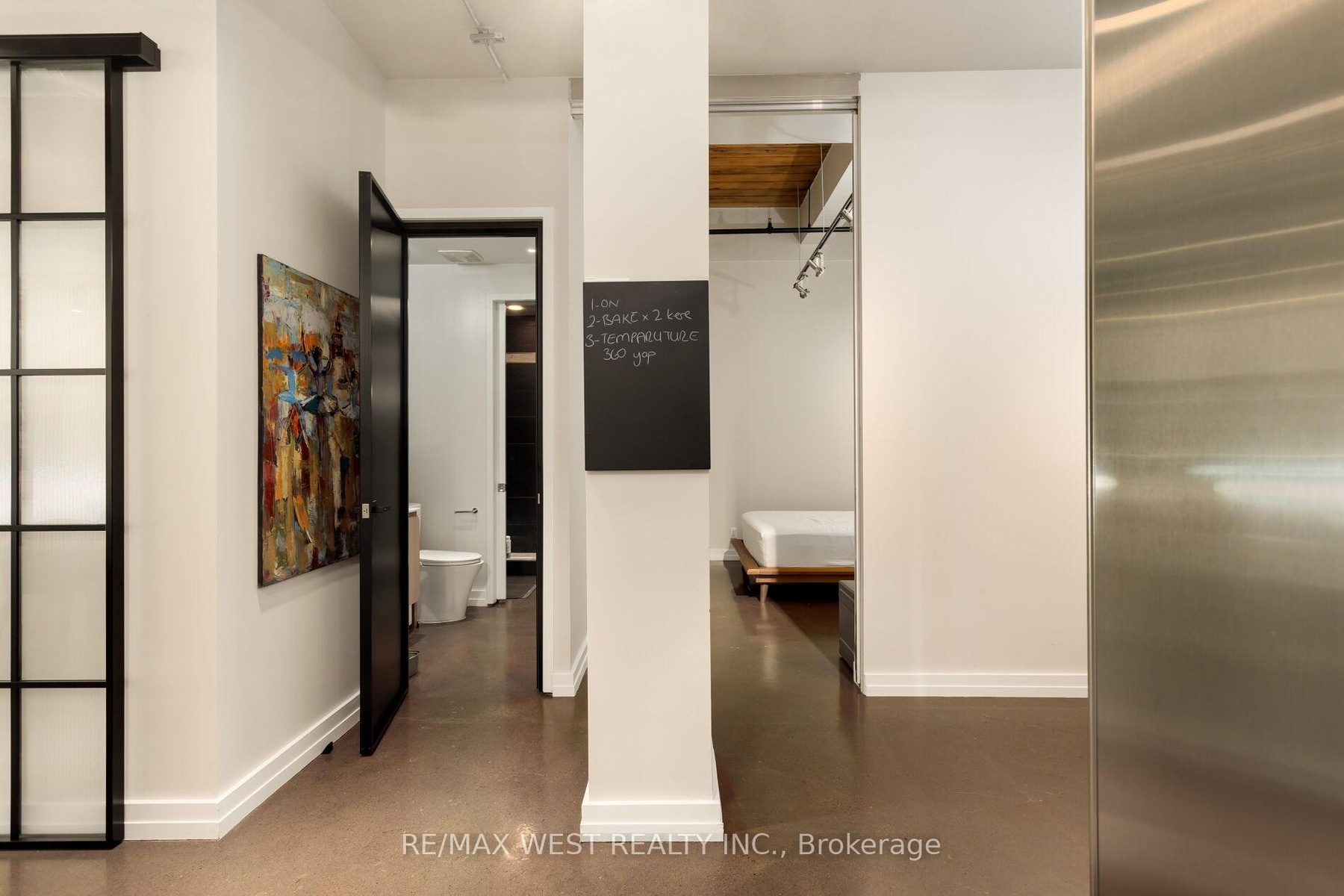 Experience unparalleled sophistication in this custom-crafted hard loft, a rare gem nestled within the historic Irwin Toy Factory in the heart of Liberty Village - one of Toronto's most vibrant and sought-after neighborhood's. Offering approximately 1,475 square feet of interior elegance and a 191-square-foot private terrace, this residence perfectly balances expansive open-concept living with intimate outdoor retreat. Step inside and be captivated by the loft's 13-foot Douglas Fir beamed ceilings, exposed brick walls, and beautifully restored concrete floors - a seamless fusion of industrial heritage and modern refinement. Every detail has been thoughtfully curated to blend timeless character with contemporary luxury. The chef-inspired kitchen is a culinary showpiece, featuring top-of-the-line Sub-Zero and Miele appliances, a Frigidaire gallery induction cooktop, Scavolini white gloss cabinetry, and exquisite marble countertops with a waterfall island and built-in wine fridge. A separate storage/pantry room and dedicated laundry room with custom built-ins ensure both practicality and sophistication. The upgraded bathroom exudes European elegance with Italian ceramic finishes, while Komandor custom closets, including a walk-in closet, provide elevated organization throughout. Upgraded mirrored sliding storage doors further enhance the home's architectural flow and style. Enjoy the comfort of automated window blinds, offering ambiance and privacy at your fingertips, and the convenience of an extra-large parking space that accommodates two vehicles with ease.