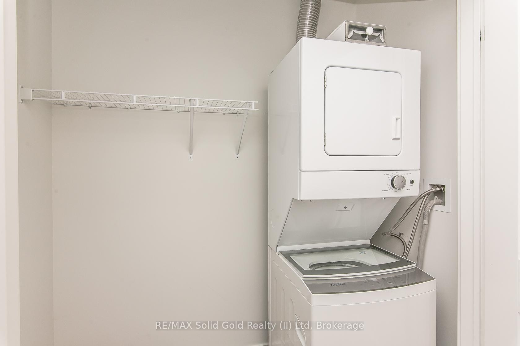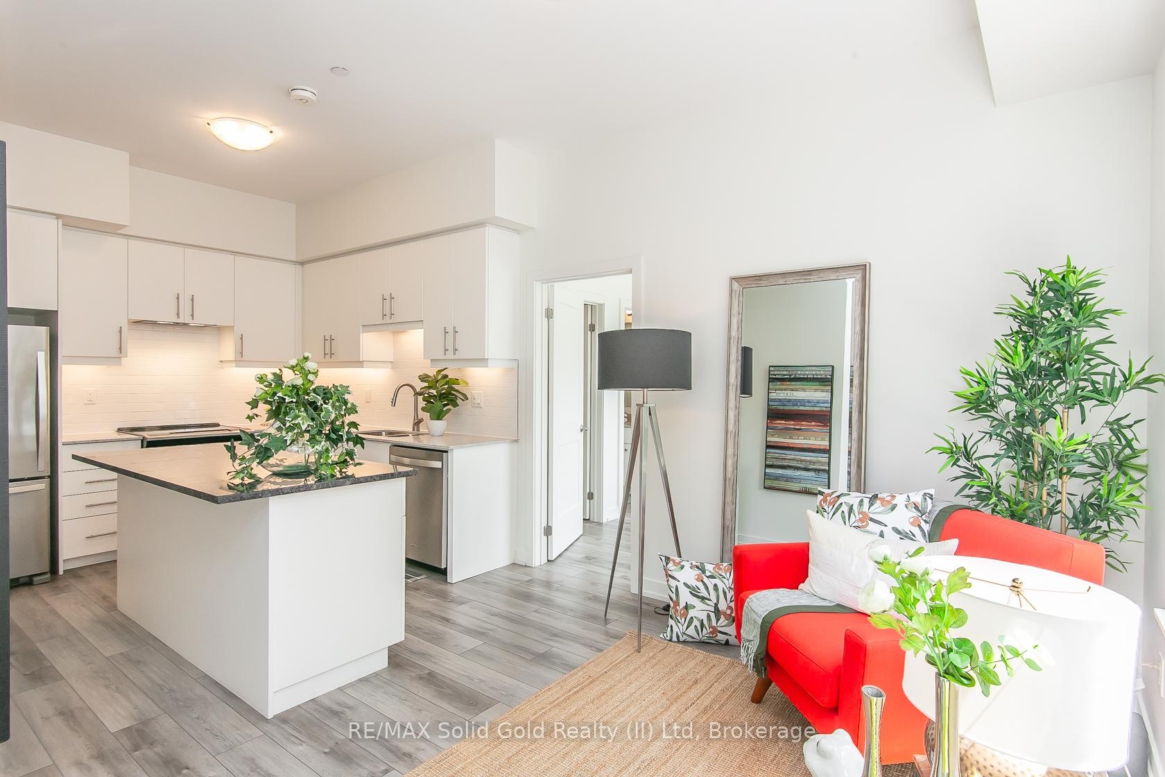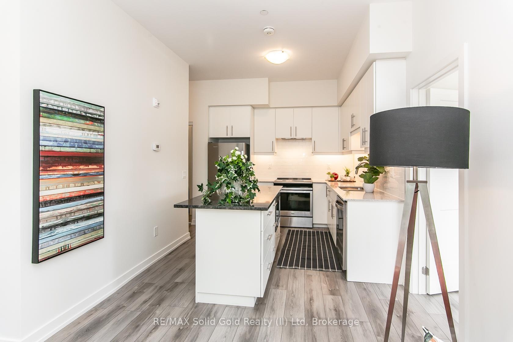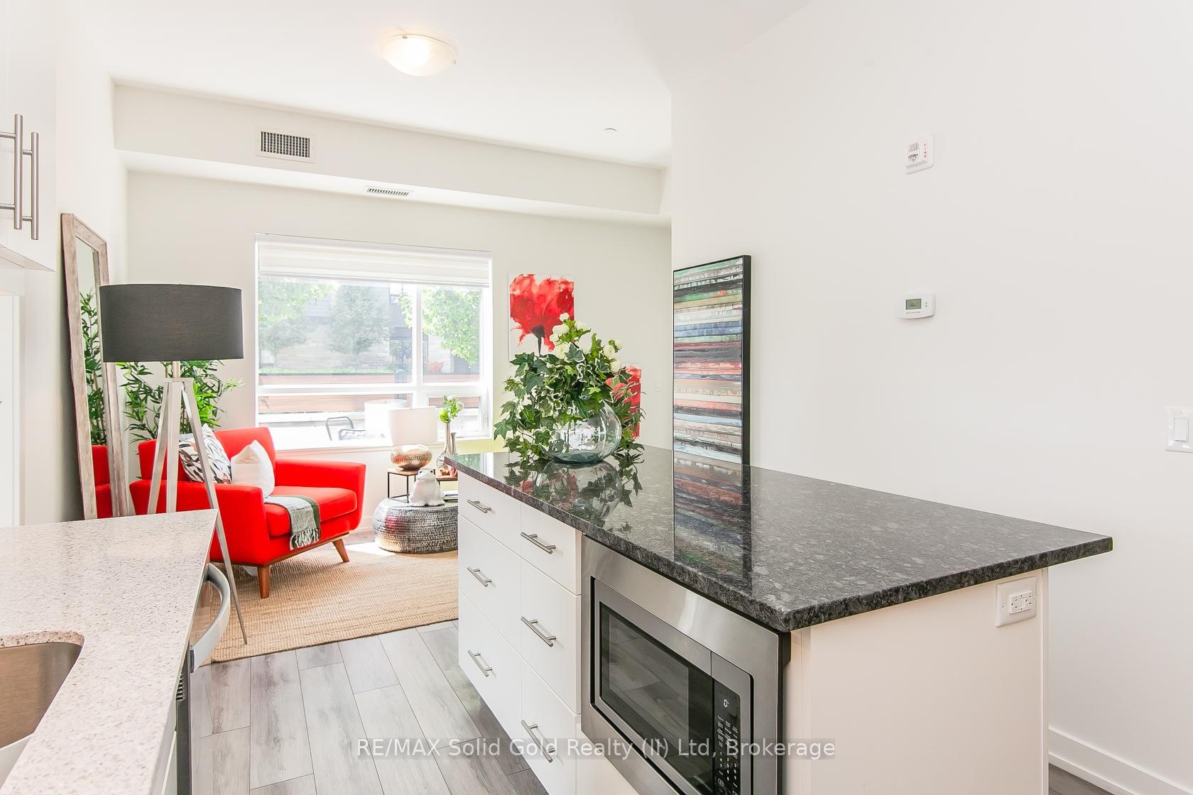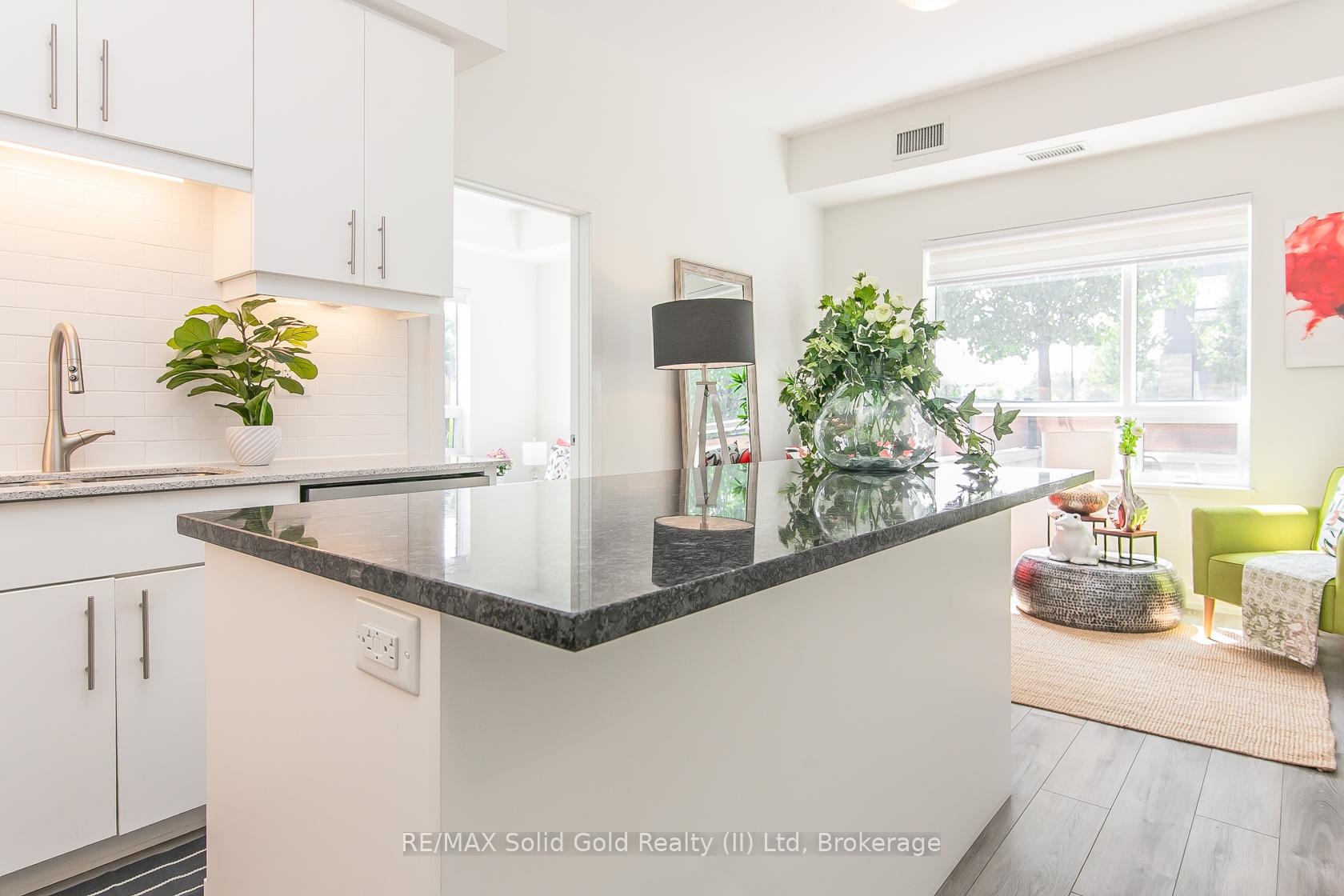 Ground-floor living meets ultimate convenience at Blackstone! This modern 2-bedroom, 2-bath condo offers over 800 sq. ft. plus a massive 270 sq. ft. private patio with natural gas hookup perfect for BBQs or a fire table. Ideal for dog owners, walkers, and cyclists, you can drop groceries at your door, skip the elevators, and enjoy easy in-and-out access. Inside, you'll find an upgraded kitchen with a granite topped island with built-in microwave, stainless steel appliances, under-mount sink with new faucet, extended upper cabinets, white subway tile backsplash, and plenty of pull-out drawers. The open-concept layout features luxury laminate flooring throughout completely carpet-free. The spacious primary suite includes its own bathroom, while the second bedroom and full bath offer flexibility for guests or a home office. A large laundry closet with stackable washer and dryer adds everyday practicality. Freshly painted and move-in ready, this unit also gives you access to Blackstones impressive amenities: a stylish party room, business centre, and fitness facility.