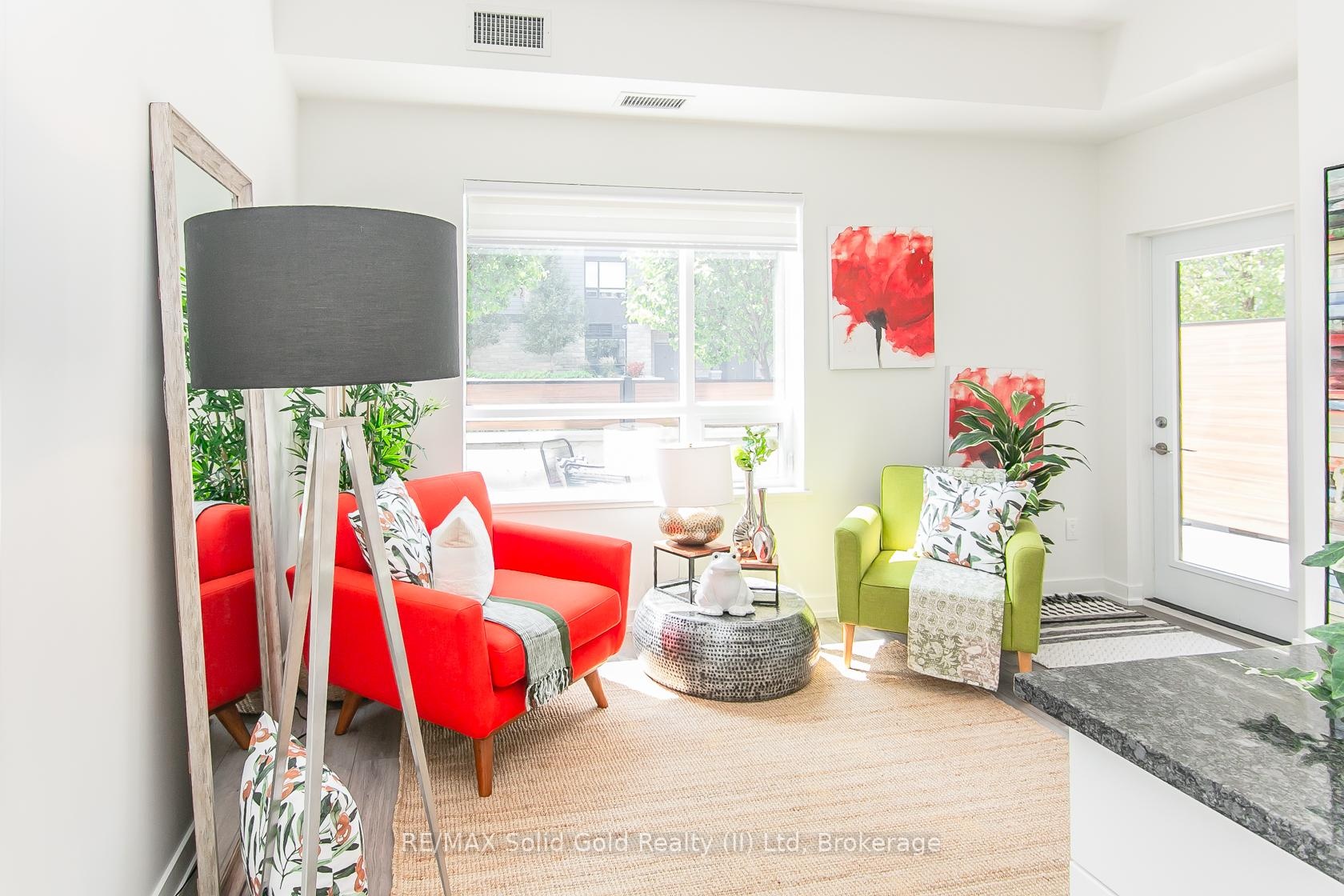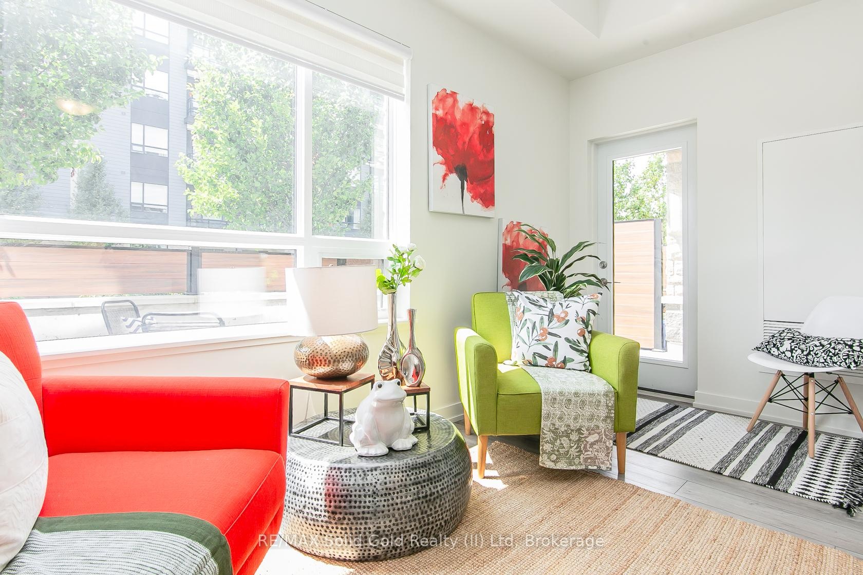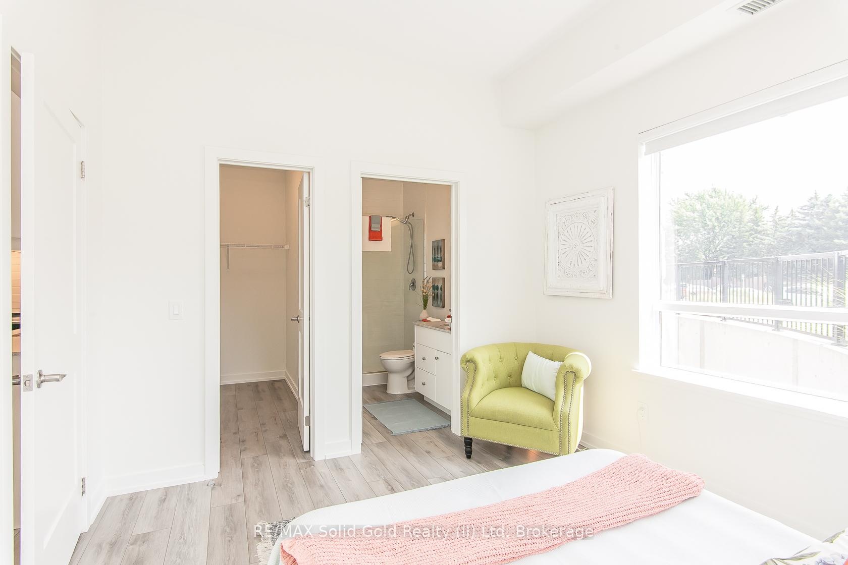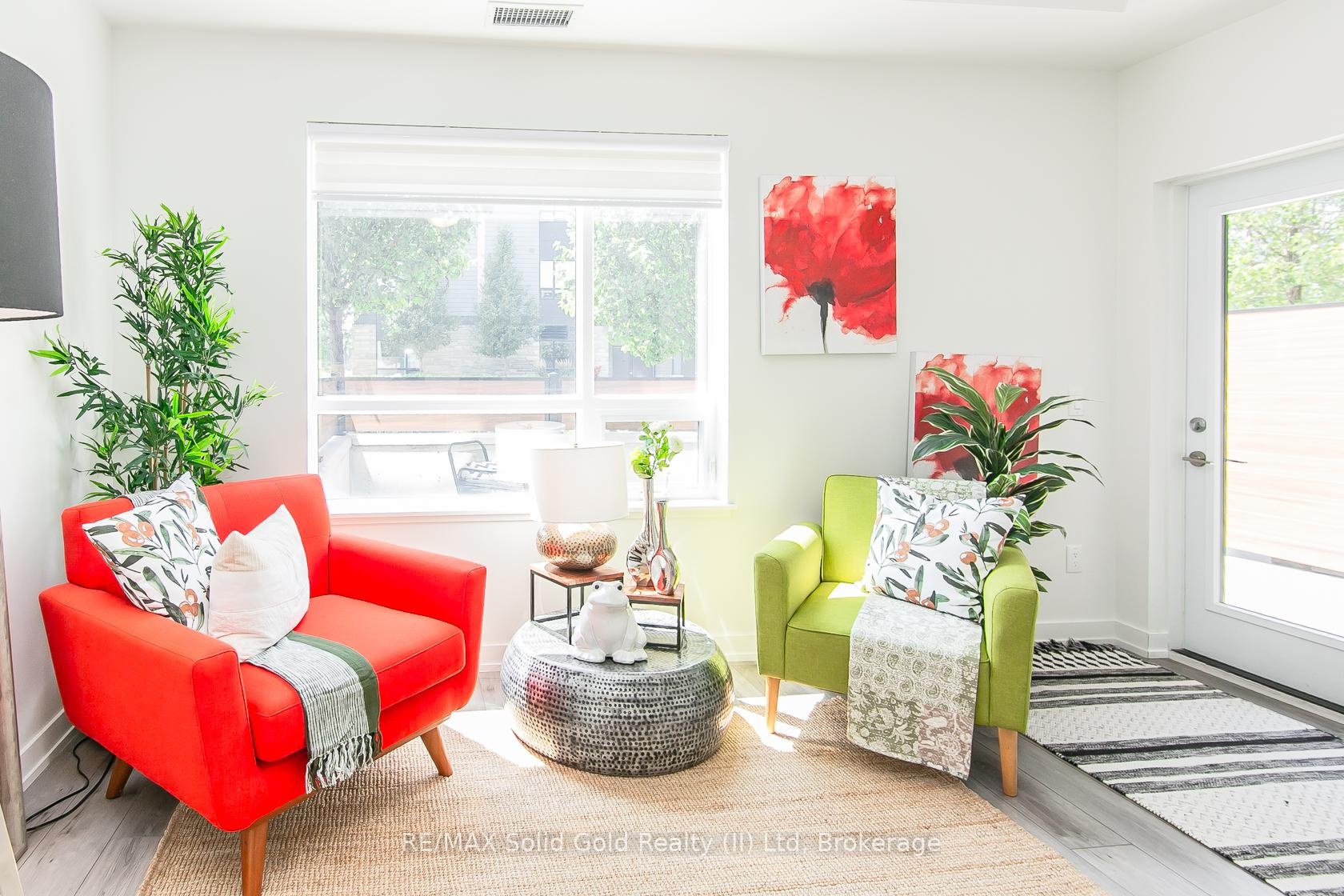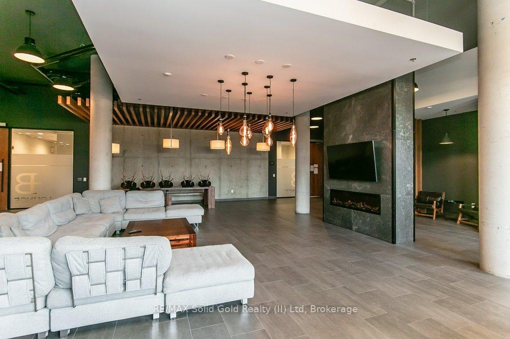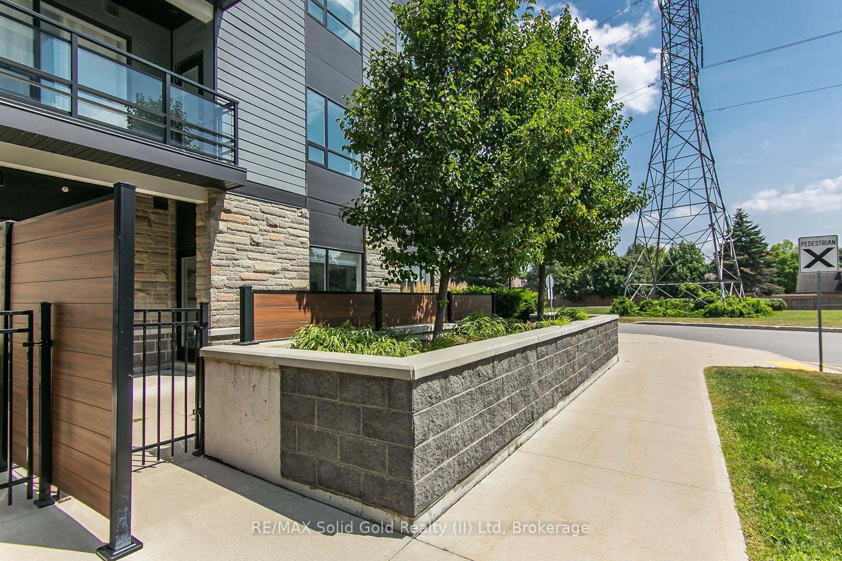 Ground-floor living meets ultimate convenience at Blackstone! This modern 2-bedroom, 2-bath condo offers over 800 sq. ft. plus a massive 270 sq. ft. private patio with natural gas hookup perfect for BBQs or a fire table. Ideal for dog owners, walkers, and cyclists, you can drop groceries at your door, skip the elevators, and enjoy easy in-and-out access. Inside, you'll find an upgraded kitchen with a granite topped island with built-in microwave, stainless steel appliances, under-mount sink with new faucet, extended upper cabinets, white subway tile backsplash, and plenty of pull-out drawers. The open-concept layout features luxury laminate flooring throughout completely carpet-free. The spacious primary suite includes its own bathroom, while the second bedroom and full bath offer flexibility for guests or a home office. A large laundry closet with stackable washer and dryer adds everyday practicality. Freshly painted and move-in ready, this unit also gives you access to Blackstones impressive amenities: a stylish party room, business centre, and fitness facility.