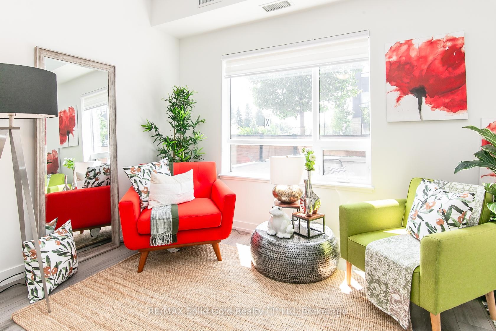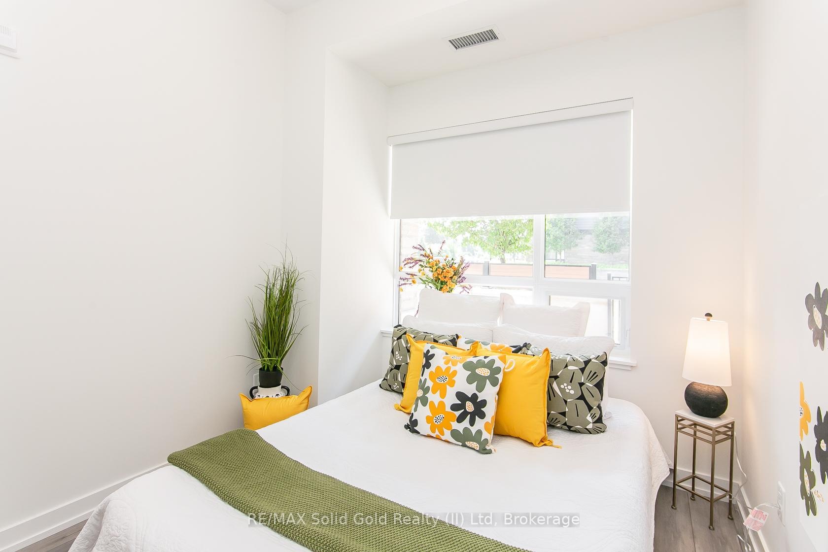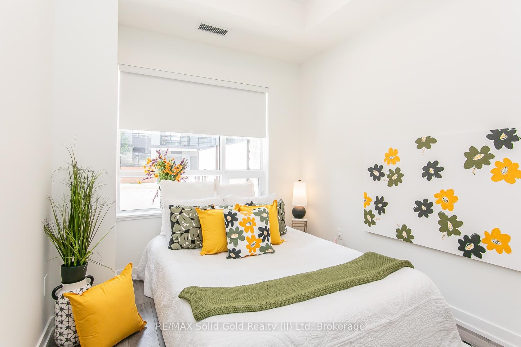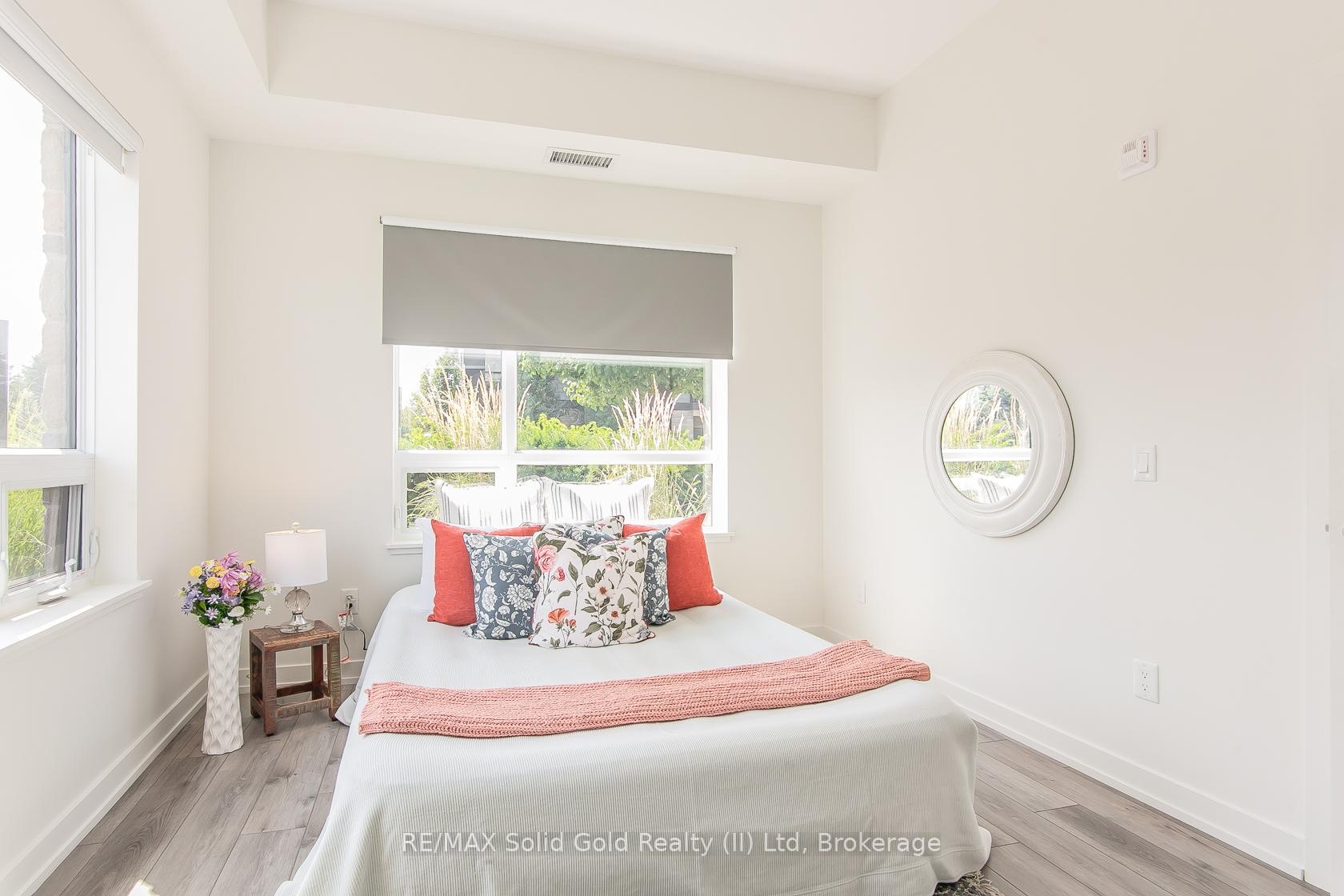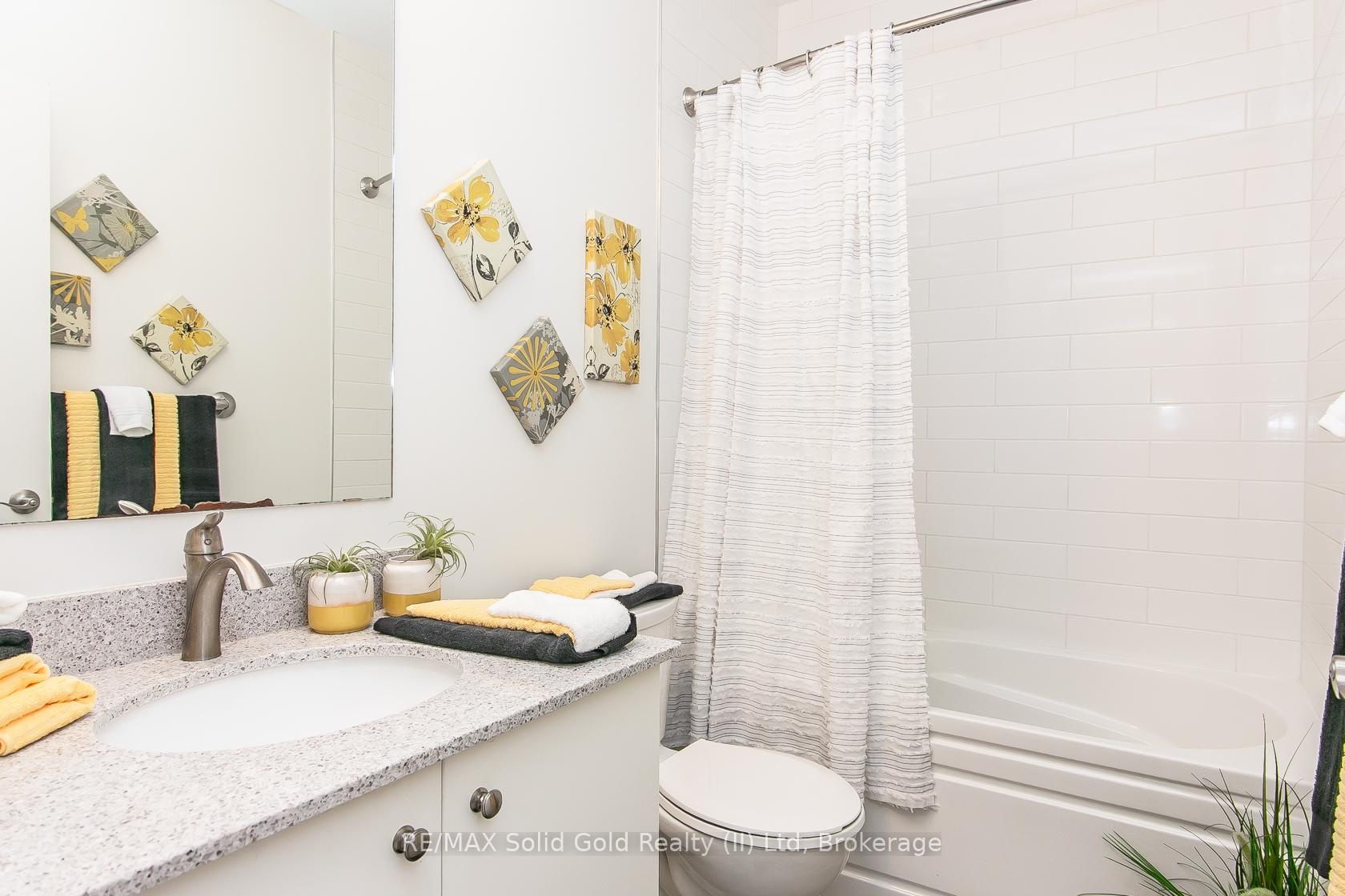 Ground-floor living meets ultimate convenience at Blackstone! This modern 2-bedroom, 2-bath condo offers over 800 sq. ft. plus a massive 270 sq. ft. private patio with natural gas hookup perfect for BBQs or a fire table. Ideal for dog owners, walkers, and cyclists, you can drop groceries at your door, skip the elevators, and enjoy easy in-and-out access. Inside, you'll find an upgraded kitchen with a granite topped island with built-in microwave, stainless steel appliances, under-mount sink with new faucet, extended upper cabinets, white subway tile backsplash, and plenty of pull-out drawers. The open-concept layout features luxury laminate flooring throughout completely carpet-free. The spacious primary suite includes its own bathroom, while the second bedroom and full bath offer flexibility for guests or a home office. A large laundry closet with stackable washer and dryer adds everyday practicality. Freshly painted and move-in ready, this unit also gives you access to Blackstones impressive amenities: a stylish party room, business centre, and fitness facility.