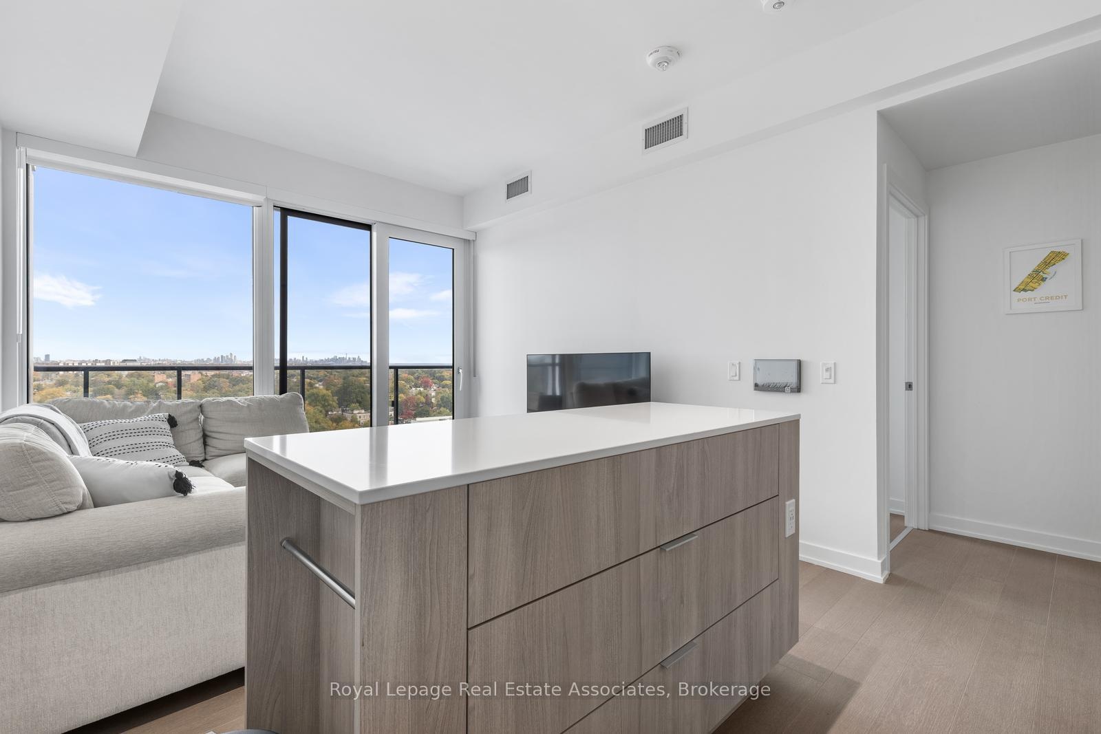 Beautiful modern 1 bed, 1 bath condo with southeast exposure in the heart of Port Credit! Scenic city & lake views of the CN tower and Toronto skyline. The open concept layout features contemporary finishes, a chef's kitchen with stone countertops, integrated appliances, island with extendable dining table and floor-to-ceiling windows that fill the space with natural light. A spacious balcony extends your living area outdoors, offering a peaceful spot to enjoy your morning coffee or evening breeze. Nestled in the vibrant Port Credit community this location offers an unbeatable lifestyle. Spa like 4 pc. bath, 9 ft. ceilings, ensuite laundry, locker & 1 underground parking spot!! Steps from the Port Credit GO Station and the upcoming Hurontario LRT, commuting to downtown Toronto or anywhere across the GTA is effortless. Enjoy scenic walks along the waterfront trails and marina, explore boutique shops and restaurants along Lakeshore Road, or take part in the many local festivals and events that bring the neighbourhood to life throughout the year. The building offers a 24-hour concierge, a fully equipped fitness centre and yoga studio, a co-working lounge, guest suites, a pet spa, and a rooftop terrace complete with BBQs and lounge seating perfect for entertaining or unwinding. Secure underground parking, locker storage, and controlled building access provide added convenience and peace of mind.