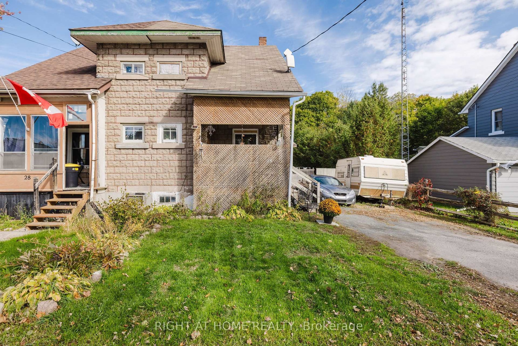 Full of light and character, this semi-detached home is ideal for those looking for comfort and affordability without compromise. The double-wide driveway and detached workshop provide excellent storage or creative space, and the deep, forested lot adds privacy and a peaceful backdrop. Inside, you'll find a bright living room, spacious dining area, and a cheerful kitchen that keeps everyone connected. The sunroom addition at the back opens to a large deck and hot tub-perfect for relaxing while the kids play. A main floor laundry, 2-piece bath, and flexible bedroom or office make daily routines simple and efficient. Upstairs, three inviting bedrooms and an updated bath complete the picture. With municipal services for water/sewer and natural gas heating, this is a move-in ready home designed for real life and real comfort.