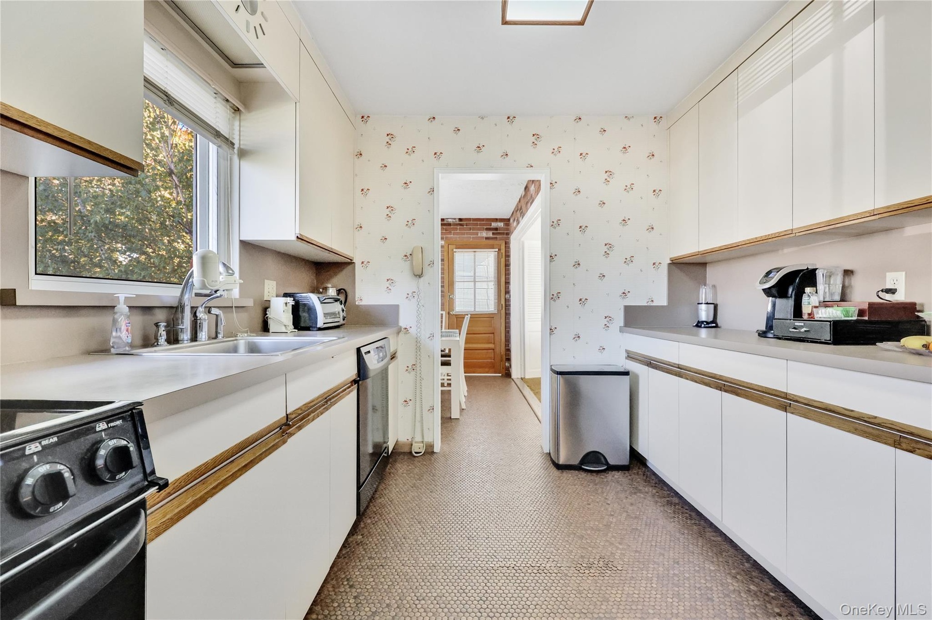 - Kitchen with white cabinetry, wallpapered walls, black stove, and light countertops